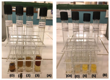 ![]() Figura 6. Bioprodutos obtidos a partir do óleo de abacate (A): (O) Óleo de abacate; (1) Óleo corporal bifásico 1; (2) Óleo corporal bifásico 2; (3) Óleo corporal bifásico 3. Bioprodutos obtidos a partir do óleo de coco (B): (OI) Óleo de Coco industrial; (O) Óleo de coco, (4) Óleo corporal bifásico 4; (5) Óleo corporal bifásico 5