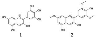 FITOQUÍMICA As plantas produzem no seu metabolismo dois tipos de metabólitos denominados primários e secundários. Os primeiros são formados principalmente pelas proteínas, carboidratos e lipídeos que são responsáveis pelo crescimento, reprodução e formação das estruturas de sustentação das plantas. Já os metabólitos secundários constituem as formas de comunicação das plantas com o meio ambiente, no processo de proteção contra a radiação do sol (antioxidantes), contra organismos predadores, como fungos, bactérias e insetos, e na produção de feromônios para polinização e garantir a sobrevivência das espécies.14 Estudos realizados com diferentes partes e extratos das duas espécies do gênero Cryptostegia constataram a presença de vários tipos de compostos do metabolismo secundário como fenóis, incluindo flavonoides, taninos e ácidos fenólicos, terpenos, saponinas, esteroides, triterpenoides, glicosídeos cardíacos entre outros, que tem potencial para a utilização em processos anti-inflamatórios, como antidiabéticos e analgésicos.15-17 Proteínas também foram caracterizadas no látex de C. grandiflora e as principais proteinases pertencem ao grupo cisteína. De acordo com Augustus et al.,18 C. grandiflora, além de possuir polifenóis (6,9%), possui também 14,0% de proteína, 6,5% de triglicerídeos e 2,13% de hidrocarbonetos. A fração de hidrocarboneto é representada pelo cis-1,4-poliisopreno (borracha natural) e a fração oleosa contém ácidos graxos saturados e insaturados. Os compostos fenólicos são os representantes com maior número de estruturas caracterizadas. Compostos fenólicos Os compostos fenólicos estão cada vez mais despertando interesse por parte da comunidade científica, indústria alimentar e farmacêutica. Já é comprovado que auxiliam processos metabólicos com efeitos benéficos para a saúde e prevenção de doenças como atividades antioxidantes, anticarcinogénicas, antienvelhecimento, antimicrobiana, efeito cardioprotetor e propriedades anti-inflamatórias.19-22 Dentre os compostos que exercem ação antioxidante e estão presentes em C. grandiflora pode-se citar os flavonoides delfinidina (1) e malvidina (2) (Figura 1).23