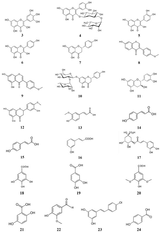 A composição percentual de compostos fenólicos mostrou ser alta no extrato metanólico de C. grandiflora que também revelou ser bastante ativo como um anticorrosivo para o aço em meio de H2SO4 1 mol L-1. A inibição de corrosão do extrato de C. grandiflora foi caracterizada por estudos de FT-IR, espectros UV/VIS e DRX; esses mostram a forte interação entre a superfície do metal e o inibidor.15 A análise por UHPLC (ultra-high perfromance liquid cromatography) revelou a presença para o extrato metanólico de C. grandiflora de vários tipos de compostos fenólicos como citados abaixo cujas estruturas estão mostradas na Figura 2.