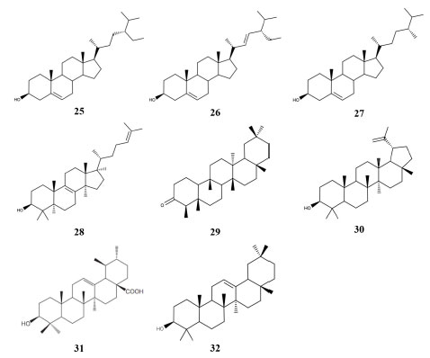 Esteroides e triterpenos Esteróides e triterpenos são compostos frequentes nas plantas e em algumas espécies ambos são sintetizados. Eles também têm uma ampla gama de aplicações comerciais nos setores de alimentos, cosméticos, farmacêutico e biotecnologia industrial.24 A partir dos extratos hexânicos e de acetato de etila de C. grandiflora foi encontrada uma mistura (Figura 3) dos fitoesteróis β-sitosterol (25), estigmasterol (26) e campesterol (27), e dos triterpenos lanosterol (28), friedelina (29), lupeol (30), ácido ursólico (31) e β-amirina (32).25