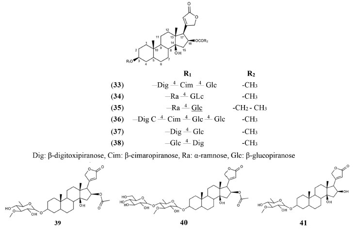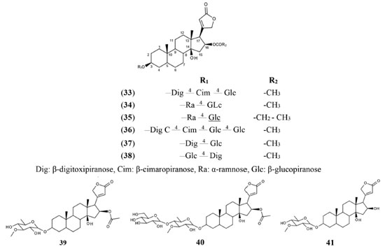 Glicosídeos cardíacos e agliconas (Cardenolideos) Glicosídeos cardíacos são compostos contendo um núcleo esteroidal, apresentando neste núcleo duas hidroxilas, uma secundária em C-3 onde normalmente se liga o açúcar e outra terciária em C-14; um hidrogênio ou uma hidroxila em C-5, uma metila em C-13 e um ciclo lactônico α,β-insaturado na posição C-17. Os glicosídeos cardíacos são uma classe de compostos orgânicos que aumentam a força do coração e sua taxa de contrações, atuando na bomba ATPase de sódio-potássio celular.26 Certos glicosídeos cardíacos são usados clinicamente como medicamentos no tratamento de doenças cardíacas e possuem potentes atividades anticâncer mostradas nos ensaios baseados em células e in vivo.27-29 Foram isolados das folhas de C. grandiflora os seguintes glicosídeos cardíacos, (Figura 4): oleandrigenina 3-O-β-glicopiranosil-(1,4)-β-cimaropyranosil-(1,4)-β-digitoxopiranoside (33), oleandrigenina 3-O-β-glicopiranosil-(1,4)-α-rhamnopiranosídeo (34), 3-O-β-glicopiranosil-(1,4)-α-rhamnopiranosideo (35) oleandrigenina 3-O-β-glicopiranosil-(1,6)-β-glicopiranosil-(1,4)-β-cimaropiranosil-(1,4)-β-digitoxopiranosideo (36), 16-O-acetil-digitalinum verum (37), subalpinosídeo ou oleandrigenina 3-O-β-D-glicopiranosil-(1,4)-β-D-digitoxopiranosídeo (38),28 criptogandsido A (39) e B (40)30 e 16-propionilgitoxigenina (41).31