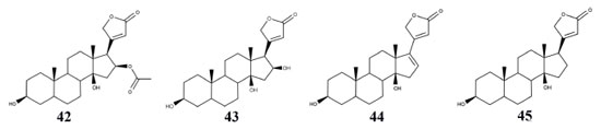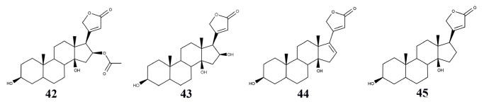 Cardenolideos foram isolados e identificados em C. grandiflora (Figura 5) como oleandrigenina (42), gitoxigenina (43) e 16-anidrogitoxigenina (44),31 enquanto para C. madagascariensis é possível encontrar oleandrigenina (42), 16-anidrogitoxigenina (44) e digitoxigenina (45).29