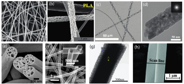 ![]() Figura 2. Imagens de microscopia eletrônica de diferentes tipos de nanofibras eletrofiadas: (a) NFs poliméricas de superfície lisa. Reproduzida com permissão da referência 77. Copyright 2018 Elsevier. (b) NFs poliméricas de poli(ácido lático) porosas. Reproduzida com permissão da referência 78. Copyright 2019 American Chemical Society. (c) NFs poliméricas de poli(metil metacrilato) com beads. Reproduzida com permissão da referência 79. Copyright 2005 American Chemical Society. (d) NFs de hidroxiapatita. Reproduzida com permissão da referência 80. Copyright 2009 John Wiley & Sons. (e) NFs porosas de TiO2. Reproduzida com permissão da referência 81. Copyright 2011 John Wiley & Sons. (f) NFs compósitas ocas de ZnO/ZnFe2O4. Reproduzida com permissão da referência 82. Copyright 2019 American Chemical Society. (g) NFs coaxiais de CaCu3Ti4O12 (núcleo) e Al2O3 (casca). Reproduzida com permissão da referência 83. Copyright 2018 American Chemical Society. (h) NFs Janus de [Fe3O4/PVP]//[Tb(BA)3phen/PVP]. Reproduzida com permissão da referência 84. Copyright 2019 The Royal Society of Chemistry