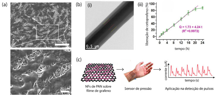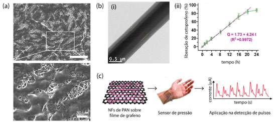 ![]() Figura 3. (a) Imagens de MEV evidenciando a proliferação de células endoteliais sobre scaffolds formados por NFs de colágeno:quitosana:P(LLA-CL) na proporção 60:15:25. Reproduzida com permissão da referência 118. Copyright 2013 John Wiley & Sons. (b) (i) Imagem de TEM das NFs triaxiais e (ii) gráfico de liberação do cetoprofeno em função do tempo. Adaptada com permissão da referência 125. Copyright 2015 American Chemical Society. (c) Esquema demonstrando o desenvolvimento e funcionamento do sensor de pulso (pressão) arterial formados por NFs de PAN sob filmes de grafeno. Adaptada com permissão da referência 129. Copyright 2019 American Chemical Society