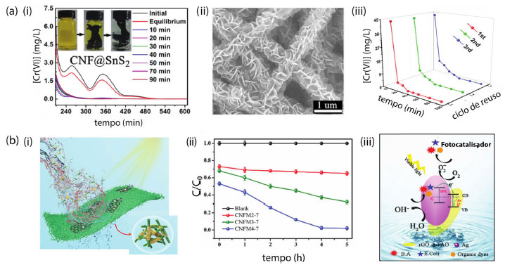 ![]() Figura 4. (a) (i) Espectros de absorção UV-vis de Cr(VI) na presença das membranas CNF@SnS2, (ii) imagem de MEV evidenciando a estrutura hierárquica das NFs de CNF@SnS2 e (iii) performance fotocatalítica após três ciclos de degradação. Adaptada com permissão da referência 177. Copyright 2016 American Chemical Society. (b) (i) Representação esquemática da manta em processo de filtração e sua microestrutura, (ii) fotodegradação do ácido benzoico (BA) quando em contato com a manta e sob irradiação UV, (iii) representação do mecanismo de fotodegradação proposto. Adaptada com permissão da referência 178. Copyright 2019 American Chemical Society