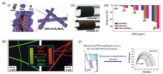 ![]() Figura 5. (a) (i) Ilustração representativa da estrutura ternária das nanofibras de CNFs/CoS2/MoS2, (ii) fotografia digital representando a flexibilidade da manta antes e após a calcinação e (iii) resposta elétrica seletiva do sensor na presença de diferentes concentrações de NO. Adaptada com permissão da referência 191. Copyright 2020 American Chemical Society. (b) Esquema evidenciando a mudança da cor de emissão de NFs multifuncionais em função do pH e da concentração de Fe(III). Adaptada com permissão da referência 207. Copyright 2015 American Chemical Society. (c) Representação esquemática de operação do biossensor baseado em NFs de PA6/PPy/ZnO/urease para detecção de ureia em amostras de leite. Adaptada com permissão da referência 64. Copyright 2018 Elsevier