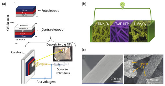 ![]() Figura 6. (a) Esquema de célula solar contendo NFs como membrana eletrolítica. O detalhe mostra a deposição das NFs de CA e DCA. Adaptada com permissão da referência 217. Copyright 2019 Springer Nature. (b) Representação de LIBs desenvolvida utilizando NFs como cátodo, separador e ânodo. Adaptada com permissão da referência 218. Copyright 2014 American Chemical Society. (c) Imagens MEV das NFs formadas por PAN/NiO/DCDA (i) antes e (ii) após o processo de carbonização à 800 °C. Adaptada com permissão da referência 219. Copyright 2018 John Wiley & Sons