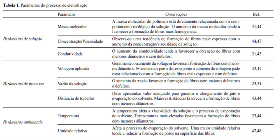 No processo de eletrofiação, a solução polimérica contida no reservatório é forçada a passar pelo capilar metálico, o que leva a formação de uma gota que é mantida na ponta do mesmo por forças de tensão superficial.31 Em seguida, a aplicação de um campo elétrico, geralmente da ordem de 5 a 30 kV, induz a formação de cargas elétricas na superfície do líquido. A repulsão eletrostática e as forças de Coulomb são as principais forças motrizes para induzir a distorção da geometria da gota.20 Quando o campo aplicado atinge um valor crítico, as forças elétricas repulsivas superam as forças de tensão superficial e a gota se alonga adquirindo um formato cônico, conhecido como cone de Taylor, a partir do qual um jato carregado da solução é ejetado.20,38,39 À medida que o jato se movimenta na direção do coletor, ocorre a evaporação do solvente e a solidificação das NFs, as quais são depositadas, sob a forma de uma membrana, na superfície do coletor aterrado.20,40 Em geral, o mecanismo de formação de fibras eletrofiadas pode ser dividido em quatro etapas consecutivas: (i) formação de cargas elétricas na gota da solução polimérica e formação do cone de Taylor; (ii) extensão do jato carregado ao longo de uma linha reta; (iii) afinamento do jato na presença do campo elétrico e aumento da instabilidade elétrica; (iv) solidificação e coleta do jato como fibra sólida no coletor.41 Uma discussão mais detalhada sobre essas etapas pode ser encontrada em outros trabalhos de revisão disponíveis na literatura.14,20,39,41-45 Apesar da simples configuração experimental, o processo de eletrofiação é influenciado por diferentes parâmetros que podem ser classificados em parâmetros de solução, parâmetros de processo e parâmetros ambientais, conforme apresentado na Tabela 1. O controle desses parâmetros permite modular a morfologia, o diâmetro (espessura) e o alinhamento das NFs, sendo de extrema importância para direcionar a aplicação das NFs em diferentes áreas.26,31,46