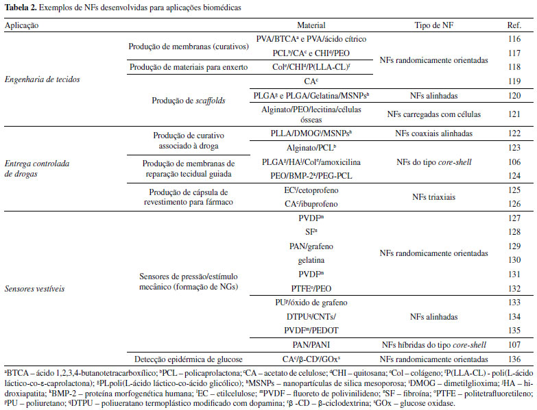 APLICAÇÕES DE NANOFIBRAS ELETROFIADAS Os avanços no desenvolvimento de novos materiais, da técnica de eletrofiação e das técnicas de caracterização vêm permitindo que as NFs produzidas sejam aplicadas em áreas biomédicas, ambientais, de (bio)sensoriamento químico e de conversão e armazenamento de energia, como será discutido nas próximas seções. Aplicações biomédicas Nas últimas duas décadas, a eletrofiação surgiu como uma estratégia promissora para a produção de nanomateriais para aplicações biomédicas.29,49,63,68,112 Nesse sentido, a técnica de eletrofiação vem sendo amplamente utilizada para o desenvolvimento de sistemas de liberação controlada, membranas para cicatrização de feridas e regeneração tecidual e no desenvolvimento de (bio)sensores vestíveis.113-115 A Tabela 2 apresenta alguns exemplos de aplicações de NFs na área biomédica reportados na última década.