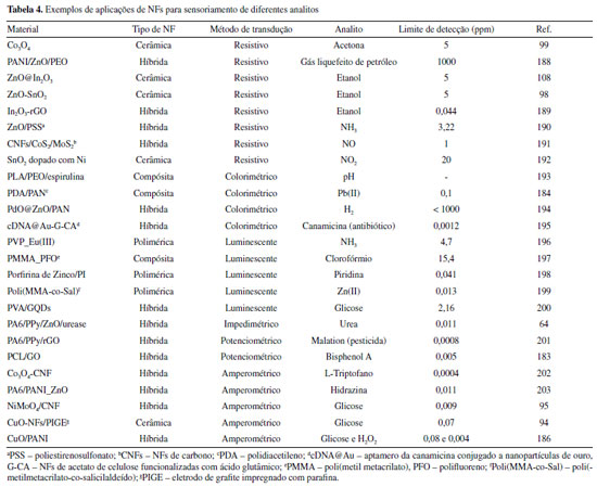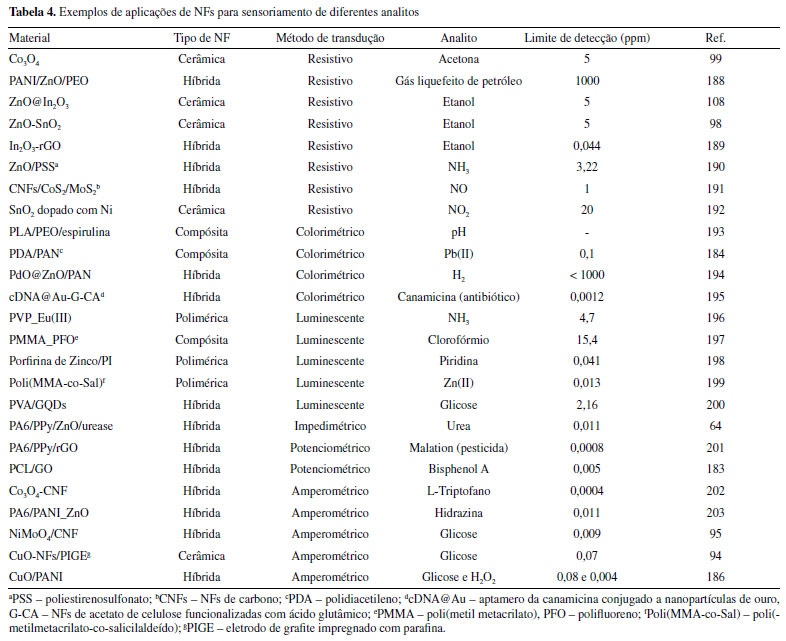 Aplicações em (bio)sensores químicos Como mencionado anteriormente, as membranas formadas por NFs apresentam estruturas típicas em rede 3D com elevada área superficial e alta porosidade, características altamente desejáveis para o desenvolvimento de (bio)sensores com maior sensibilidade e menor limite de detecção.33,179 Além disso, a estrutura 1D de NFs condutoras fornecem caminhos encurtados para a transferência de elétrons, facilitando assim a interação do analito ao longo do eixo longitudinal das nanofibras melhorando, portanto, o desempenho do sensor.180 Nesse cenário, as NFs têm sido amplamente exploradas para aplicação em (bio)sensores químicos visando a detecção de gases tóxicos (NH3, NOx, CO, CH4, etc),30,114 explosivos,179,181 poluentes emergentes (hormônios, fármacos, corantes orgânicos, pesticidas e inseticidas),31,179,182,183 metais pesados (Cd(VI), Cr(VI), Pb(II), Hg(II)),32,184,185 analitos de interesse biomédico,156,186,187 entre outros. Os trabalhos encontrados na literatura que tratam de (bio)sensores baseados em NFs empregam, em sua maioria, métodos de transdução resistivo, óptico e eletroquímico, também conhecidos como sensores elétricos, ópticos e eletroquímicos, respectivamente. É importante destacar que cada um desses tipos de sensores possui uma teoria referente à cada método de transdução, havendo extensa literatura dedicada à compreensão dos mecanismos de atuação destes sensores. Sendo assim, a seguir abordaremos em mais detalhes alguns exemplos recentes referentes à utilização de NFs como plataforma sensorial para obtenção destes dispositivos. A Tabela 4 apresenta um comparativo de alguns dos trabalhos mais recentes publicados na literatura que reportam sensores compostos por NFs para detecção de diferentes analitos com seus respectivos métodos de transdução e limites de detecção.