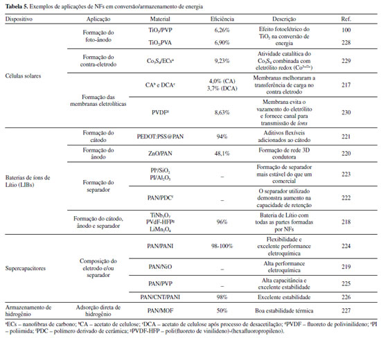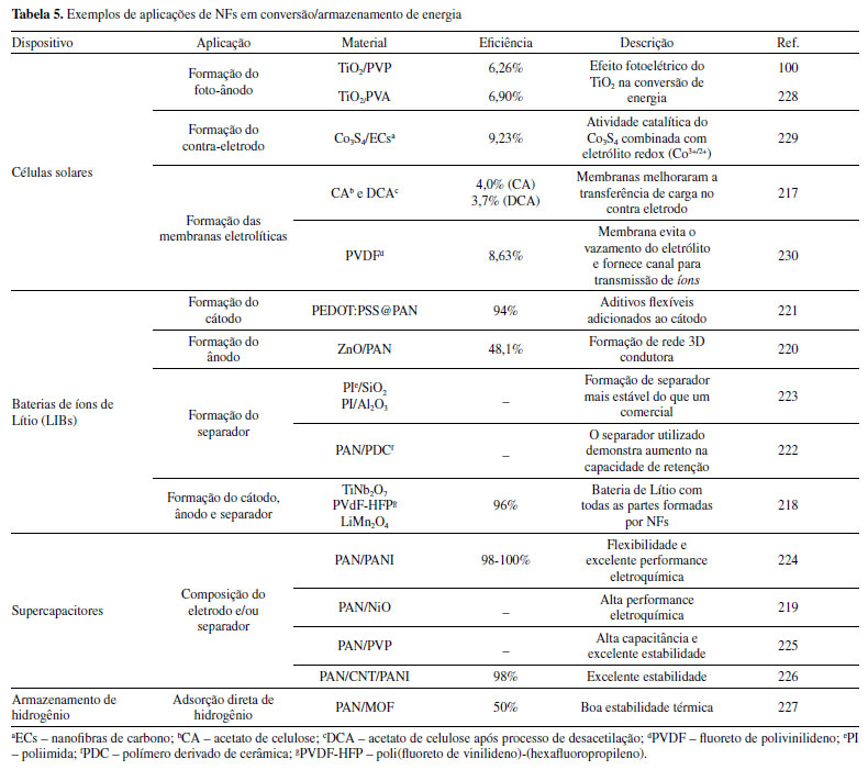 No desenvolvimento de baterias de íons de Lítio (LIBs, do inglês Lithium-ion Batteries), NFs vêm sendo utilizadas como componentes do ânodo,218,220 do cátodo221 ou do separador,222,223 ou até mesmo dos três componentes para o desenvolvimento de baterias de alta performance.218 Jayaraman et al. desenvolveram bateria utilizando NFs de óxido de manganês lítio (LiMn2O4) atuando como cátodo, NFs formadas pelo polímero poli(fluoreto de vinilideno-co-hexafluoropropileno) (PVdF-HFP) como separador e NFs de óxido de nióbio e titânio (TiNb2O7) como ânodo, conforme mostra o esquema da Figura 6b. As NFs formadas por LiMn2O4 e TiNb2O7 foram produzidas a partir de solução sol-gel onde o composto foi sintetizado utilizado o polímero PVP como suporte.218 Raulo et al. utilizaram NFs de PAN, recobertas com o polímero condutor poli(3,4-etilenodioxitiofeno):poli(estirenosulfonado) (PEDOT:PSS), como aditivos flexíveis incorporados ao cátodo da bateria de lítio-enxofre, a fim de aprisionar polissufetos de lítio e suprimir sua dissolução em eletrólito líquido. A performance eletroquímica do cátodo contendo o aditivo mostrou-se significantemente melhor em estabilidade e capacidade comparado ao formado por enxofre apenas, devido ao efeito de adsorção das nanofibras.221 No desenvolvimento de supercapacitores, NFs de carbono vem sendo utilizadas como suporte para encapsular óxidos metálicos de transição, como o NiO, e polímeros condutores, como a PANI, para produção de dispositivo com elevada área de superfície, porosidade e boa condutividade.219 O processo de desenvolvimento dos supercapacitores compreende, geralmente, a estruturação dos materiais híbridos através da eletrofiação e posterior carbonização, eliminando a fase orgânica.219,224-226 Li et al. produziram NFs formadas pelo polímero PAN, nanopartículas de NiO e dicianodiamida (DCDA) para desenvolvimento de supercapacitores. A Figura 6c mostra imagens de MEV das NFs (i) antes e (ii) após o processo de carbonização à 800 ºC. O detalhe na Figura 6c(ii) mostra a formação de poros após a remoção da fase orgânica.219 São encontradas ainda na literatura alguns trabalhos que utilizam NFs no armazenamento de hidrogênio (H2). Para tanto, as nanofibras são utilizadas na adsorção de estruturas híbridas metal-orgânicas (MOFs, do inglês Metallic Organic Frameworks), que são conhecidas pelas suas excelentes propriedades adsorventes de hidrogênio. Nas aplicações, a elevada porosidade das estruturas formadas por NFs de carbono permitem o armazenamento de grande quantidade de hidrogênio.227 A Tabela 5 apresenta alguns exemplos de aplicações de NFs em conversão e armazenamento de energia publicados na última década. A tabela relaciona o material empregado para a produção das NFs, a aplicação e a eficiência do dispositivo, além de apresentar as principais características dos mesmos.