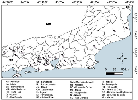 ![]() Figura 1. Mapa com a localização dos pontos de amostragem utilizados nos estudos sobre MP realizados no estado do Rio de Janeiro. Software QGIS, Fonte dos dados: Instituto Brasileiro de Geografia e Estatística - IBGE, Instituto de Pesquisa Econômica Aplicada - Ipea, IHO Sea Area