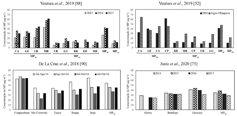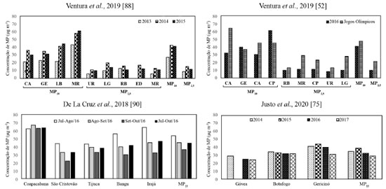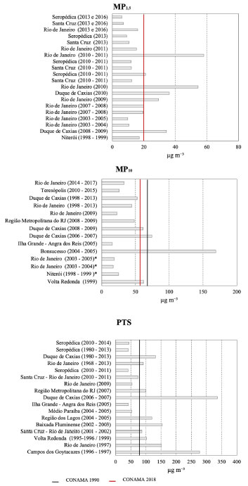 ![]() Figura 3. Concentração média de MP encontradas nos estudos realizados no estado do Rio de Janeiro e o limite estabelecido pelo CONAMA nas resoluções de 1990 e de 2018. *Corresponde a concentração de MP2,5-10