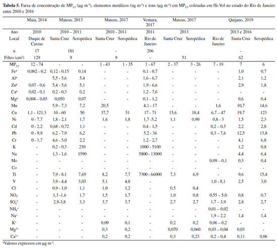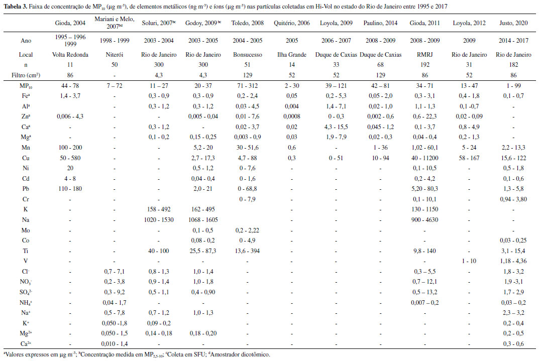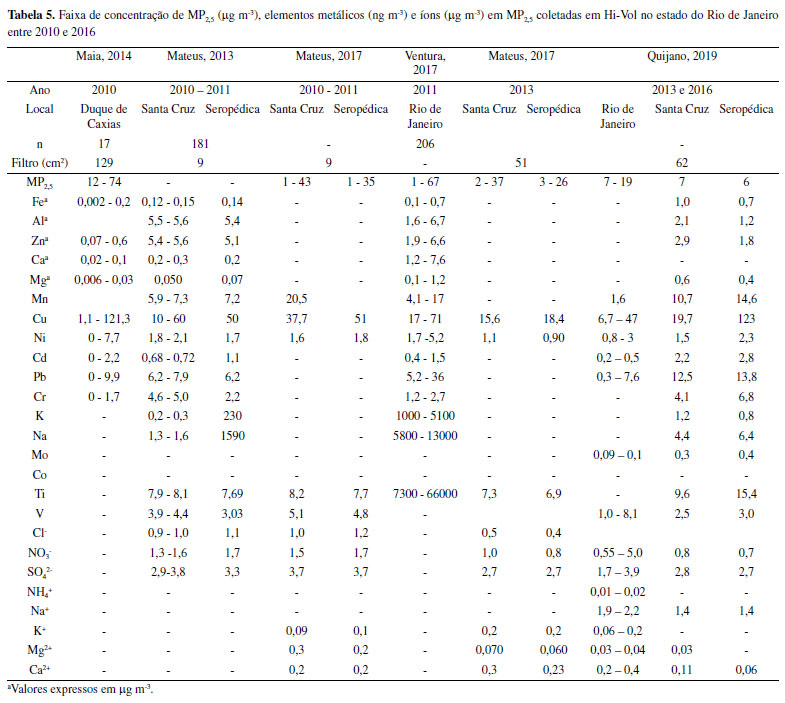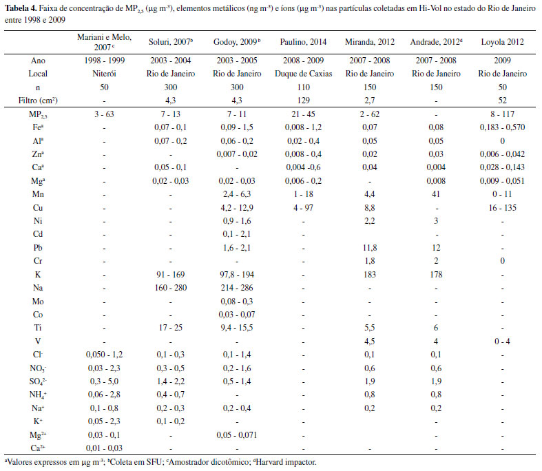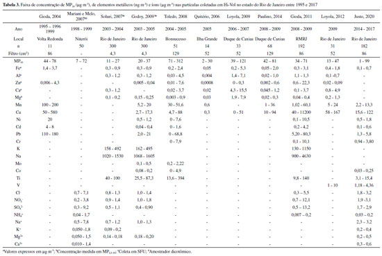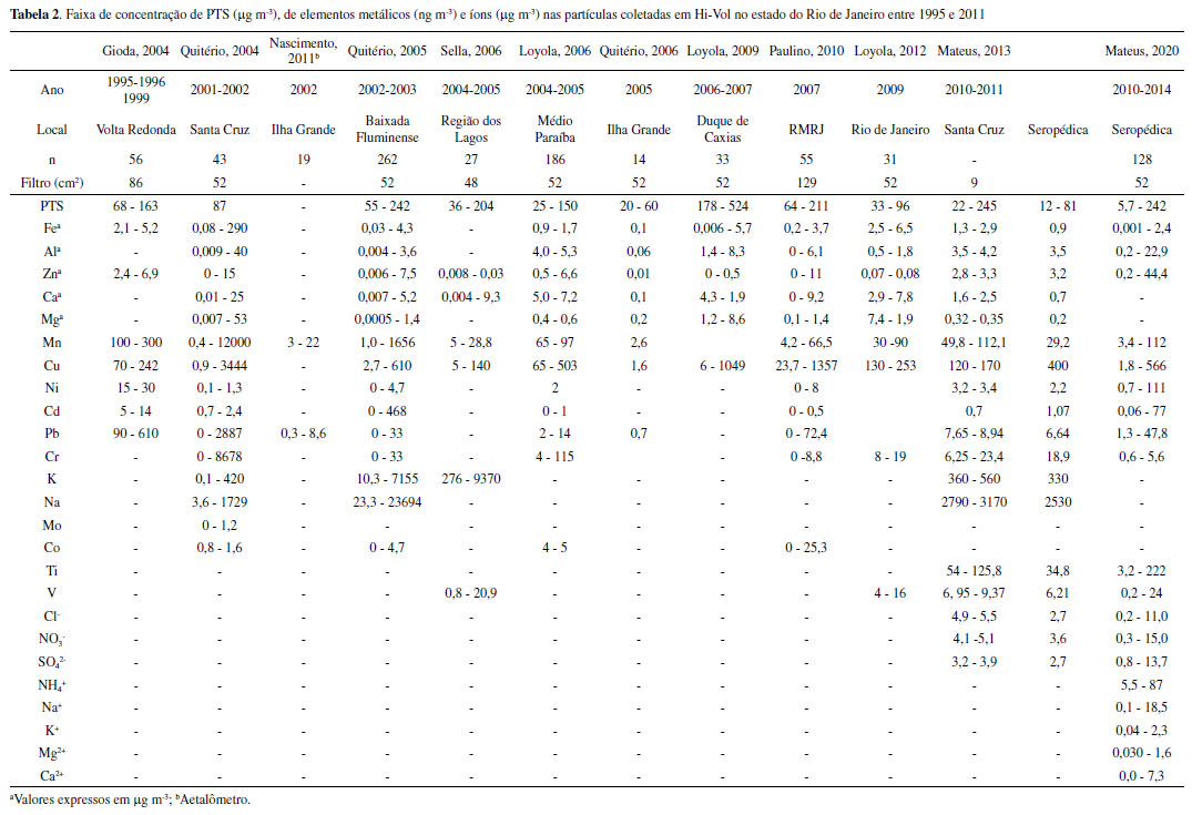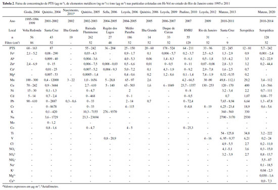 COMPOSIÇÃO ELEMENTAR DO MATERIAL PARTICULADO Concentração média dos elementos no MP O tamanho das partículas pode influenciar na concentração de seus constituintes devido aos processos de formação ou à diferença nas massas das partículas. As Tabelas 2 a 5 apresentam as faixas de concentração dos elementos metálicos e espécies iônicas encontradas no MP coletado no Rio de Janeiro entre 1995 e 2017.