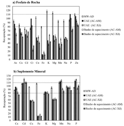 ![]() Figura 1. Valores de recuperação (%) para As, Ca, Cd, Cr, Cu, Fe, K, Mg, Mn, Na, P e Zn para os métodos de digestão ácida assistida por radiação micro-ondas (MW-AD), extração assistida por ultrassom (UAE) e extração por banho de aquecimento empregando NADES ácido cítrico, ácido málico e água (AC-AM) e NADES ácido cítrico, xilitol e água (AC-Xil) para as amostras referência a) fosfato de rocha e b) suplemento mineral33,34