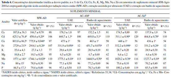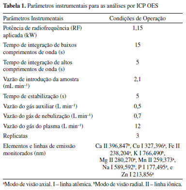PARTE EXPERIMENTAL Reagentes e amostras Água ultrapura em sistema de ultra purificação (18 MΩ cm - ICW-3000, Merck KGaA, Darmstadt, Alemanha) foi usada em todas as extrações e no preparo de todas as soluções. As vidrarias utilizadas nos experimentos foram previamente descontaminadas em banho ácido contendo 10% (v v-1) de HNO3 por 48 h, seguido de lavagem completa com água. O procedimento de digestão ácida assistida por radiação micro-ondas (MW-AD) foi realizado com HNO3 (Sigma-Aldrich, MO, EUA) previamente purificado usando um sistema de destilação abaixo do ponto de ebulição (sub-CLEAN PTFE, Milestone, BG, Itália) e 30% (m v-1) H2O2 (Sigma-Aldrich, MO, EUA). Soluções padrão para as curvas de calibração foram preparadas a partir de 1000 mg L-1 de soluções estoque monoelementares dos elementos químicos As, Ca, Cd, Cr, Cu, Fe, K, Mg, Mn, Na, P e Zn (Sigma-Aldrich, MO, EUA) por diluições consecutivas. Para a síntese dos NADES foram utilizados ácido cítrico (Sigma-Aldrich, 99,5% de pureza), DL-ácido málico (Sigma-Aldrich, 99% de pureza), xilitol (Sigma-Aldrich, 99% de pureza), todos na forma de pó cristalino branco, e água. A exatidão do método foi avaliada usando materiais de referência de suplemento mineral (RM-Agro E2001a) e fosfato de rocha (RM-Agro E2003a), produzidos pela Empresa Brasileira de Pesquisa Agropecuária (Embrapa).33,34 Os seguintes equipamentos foram empregados para o preparo das amostras e determinações: agitador magnético (LAbNet, agitador AccuPlate Hotplate, Edison, NJ, EUA), balança analítica (GEHAKA, Modelo AG200, São Paulo, SP, Brasil), forno de micro-ondas (Multiware PRO - Anton Paar GmbH, Graz, Austria), banho de aquecimento (EVLAB, Modelo B.M.EV:O15, Londrina, PR, Brasil), banho ultrassônico (Eco-Sonics, Modelo Q3.0/40 A, com frequência de 40 kHz, Indaiatuba, SP, Brasil). O ICP OES (iCAP 7000, Thermo Fisher Scientific, Madison, WI, EUA) e ICP-MS modelo NexION 300X (Perkin-Elmer, Shelton, CT) foram utilizados para as determinações dos analitos. Síntese dos NADES Dois tipos diferentes de NADES foram preparados com base no método apresentado por Santana et al.35 Os NADES foram preparados pelas combinações dos componentes: ácido cítrico, ácido málico e água (AC-AM) e ácido cítrico, xilitol e água (AC-Xil), com razão molar 1:1:10 de cada componente, respectivamente. As misturas foram colocadas em um béquer tampado com um vidro de relógio e aquecido em banho-maria por 2 horas a 50 °C sob agitação magnética na velocidade de 220 rpm. Foram sintetizados aproximadamente 100 mL de cada solvente, volume suficiente para os estudos realizados. Posteriormente, os solventes foram armazenados em dessecadores em temperatura ambiente para evitar a variação das propriedades físicas como densidade e viscosidade.36 A densidade dos NADES foi determinada de forma volumétrica utilizando picnômetro calibrado com água a 24 °C e balança analítica com precisão de ± 0,0001 g.35 A viscosidade dos solventes foi determinada empregando um viscosímetro Cannon-Fenske calibrado com água a 24 °C.35 As propriedades físico-químicas foram determinadas em triplicata. Extração assistida por ultrassom (UAE) com NADES Aproximadamente 100 mg de amostras de suplemento mineral (RM-Agro E2001a) e fosfato de rocha (RM-Agro E2003a), foram pesados diretamente em frascos de 50 mL. A seguir foram adicionados 9,0 mL de cada um dos NADES (preparados individualmente) e a mistura submetida a banho ultrassônico por 45 min. Após o tempo de extração, adicionou-se 4 mL de água e o extrato foi centrifugado a 4000 rpm por 5 minutos. Após a centrifugação, o sobrenadante foi separado do resíduo por filtração, visando evitar o contato entre o sólido e o extrato. O sobrenadante foi analisado por ICP OES e ICP-MS em até 48 h para as devidas determinações. Toda etapa de extração foi realizada em triplicata.30 Extração por banho de aquecimento com NADES Aproximadamente 100 mg das amostras de suplemento mineral (RM-Agro E2001a) e fosfato de rocha (RM-Agro E2003a) foram pesadas diretamente em frascos de 50 mL, e adicionados 9,0 mL de cada um dos NADES (sintetizados individualmente). A mistura resultante foi submetida a banho de aquecimento na temperatura de 60 °C por 45 min, sem agitação. Após a etapa de extração, adicionaram-se 4 mL de água e o extrato foi centrifugado a 4000 rpm por 5 min. Após a centrifugação, o sobrenadante foi separado do resíduo por filtração para evitar o contato entre o sólido e o extrato. O sobrenadante foi analisado por ICP OES e ICP-MS em até 48 h para as devidas determinações. Toda etapa de extração foi realizada em triplicata. Digestão ácida assistida por radiação micro-ondas (MW-AD) Digestão ácida assistida por radiação micro-ondas (MW-AD) foi empregada como método comparativo para a determinação dos teores dos elementos analisados pelos métodos de extração empregando NADES. As digestões foram realizadas em um forno micro-ondas, baseado no método descrito para a produção do material de referência de fosfato de rocha34 e por Kane and Hall (2016).37 Aproximadamente 200 mg de amostras foram digeridos em frascos fechados com 6 mL (7 mol L-1) de ácido nítrico e 2 mL de H2O2 (30% m v-1), empregando o seguinte programa de aquecimento: I) rampa de aquecimento até 190 °C por 20 min; II) permanência a 190 °C por 20 min e III) resfriamento até 50 °C por 10 min. Após a digestão, as amostras e os brancos tiveram seus volumes ajustados quantitativamente com água. Determinação de Ca, Cu, Fe, K, Mg, Mn, Na, P e Zn por espectrometria de emissão óptica com plasma acoplado indutivamente (ICP OES) Para serem analisados por ICP OES os extratos foram diluídos no intervalo de 100 a 250 vezes. Na Tabela 1 são apresentados os parâmetros instrumentais e as linhas de emissão selecionadas para determinação de cada analito monitorado. A curva de calibração para as análi