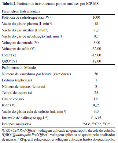 Determinação de As, Cd e Cr por espectrometria de massas com plasma acoplado indutivamente (ICP-MS) Os extratos anteriormente foram diluídos no intervalo de 100 a 250 vezes para serem analisados por ICP-MS. O sistema de introdução de amostra é equipado com nebulizador concêntrico, uma câmara ciclônica e uma tocha de quartzo com um tubo injetor de quartzo (2,0 mm d.i.). Os parâmetros instrumentais para o ICP-MS estão descritos na Tabela 2 e a análise foi realizada no modo de colisão com discriminação por energia cinética (KED) como estratégia de correção a base de gás hélio para evitar possível interferência poliatômica para 75As+ (40Ar35Cl+) e para 52Cr+ (40Ar12C+). A curva de calibração para as análises dos extratos foi realizada em meio de NADES 1% (v v-1), enquanto a curva de calibração para as análises dos digeridos foi realizada em meio de ácido nítrico 1% (v v-1), concentração próxima a dos extratos após diluídos.