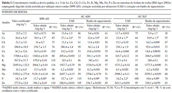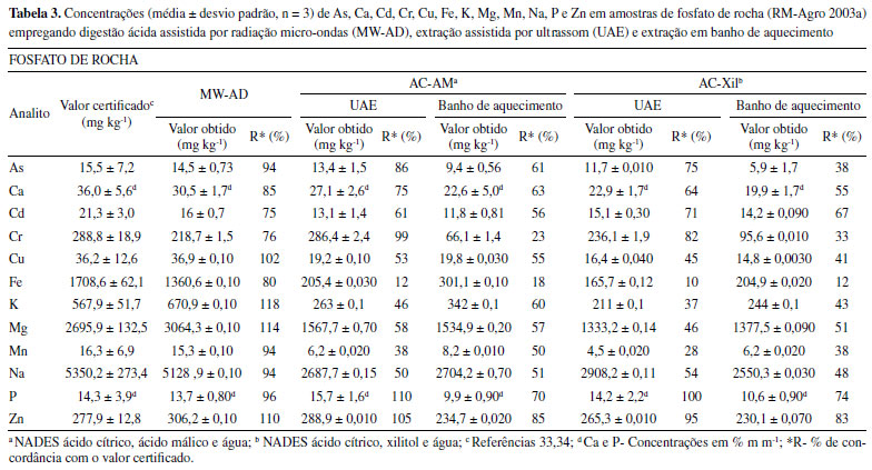 I. Departamento de Química e Ciências Ambientais, Instituto Nacional de Tecnologias Alternativas para Detecção, Avaliação Toxicológica e Remoção de Contaminantes Emergentes e Radioativos, Universidade Estadual Paulista "Júlio de Mesquita Filho", 15054-000 São José do Rio Preto - SP, Brasil Recebido em 11/10/2020 *e-mail: andrea.oliveira@ufpr.br Natural deep eutectic solvents (NADES) based on xylitol, citric acid, and malic acid were synthesized and used in ultrasound-assisted extraction (UAE) and heating-bath extraction of phosphate rock and mineral supplement samples. Arsenic, Ca, Cd, Cr, Cu, Fe, K, Mg, Mn, Na, P and Zn were determined by inductively coupled plasma mass spectrometry (ICP-MS) and inductively coupled plasma optical emission spectrometry (ICP OES). The results showed the NADES as promising solvents for extraction of inorganic matrices compared to reference values and concentrations obtained using microwave-assisted acid digestion (MW-AD). Significant differences were observed for some elements, suggesting different chemical interactions between the synthesized NADES and each monitored element. For analytes extraction of phosphate rock, UAE presented the best results for As, Cr and P. Zinc was extracted with UAE and heating bath. Concerning mineral supplement, no significant differences were observed for Ca (UAE), Cd (UAE and heating bath), K (UAE and heating bath), Mn (UAE and heating bath), Na (UAE and heating bath), and P (UAE and heating bath). The NADES is a greener and a potentially alternative for the sample preparation compared to the official methods of analysis, can being used as selective extractor solvent in conventional sample preparation methods. INTRODUÇÃO Em procedimentos experimentais como digestão ou extração, os solventes apresentam um papel crucial na etapa de preparo de amostra por meio da dissolução de sólidos, transferência de massa e extração de analitos.1 Portanto, há um grande interesse nos estudos para o desenvolvimento de novos solventes verdes, visando principalmente a substituição de solventes considerados voláteis e de elevada inflamabilidade e toxicidade.1,2 Considerando a determinação elementar de nutrientes e contaminantes em fertilizantes e suplementos minerais, a maioria dos métodos analíticos inclui algum tratamento da amostra. O preparo de amostra é uma etapa de extrema importância em um procedimento analítico, pois perdas dos analitos ou contaminações podem comprometer a precisão e a exatidão do resultado final.3,4 Os solventes eutéticos profundos (DES) são formados por um composto receptor de ligação de hidrogênio (HBA), com um composto doador de ligação de hidrogênio (HBD) dando origem a uma mistura que forma um sistema eutético, com ponto de fusão abaixo do apresentado por cada precursor individualmente.5 Quando os compostos que constituem os DES são aminoácidos, ácidos orgânicos, açúcares, ureia ou derivados de colina, os DES são denominados de solventes eutéticos naturais profundos (NADES).6,7 Durante a síntese dos NADES (e DES) não há qualquer solvente adicional ou formação de subprodutos, resultando em um material facilmente biodegradável.8 Os NADES oferecem vantagens como baixa toxicidade, biodegradabilidade, estabilização de soluto, sustentabilidade, preparo simples e viscosidade e densidade ajustáveis.9 Em geral, combinações de cloreto de colina e seus derivados (receptor de ligação de hidrogênio) com glucose, xilitol, ácido cítrico, ácido málico, ácido oxálico, ácido tartárico, ácido propanoico e frutose, atuando como doadores de ligação de hidrogênio, são os principais exemplos relatados na literatura sobre síntese dos NADES.10 A digestão ácida assistida por radiação micro-ondas (MW-AD) é um dos procedimentos mais utilizados na etapa de preparo de amostra, e pode ser utilizado como método padrão para estudos de preparo de amostra.11-14 A extração assistida por radiação ultrassônica (UAE) tem sido utilizada para o preparo de amostra. As ondas acústicas, com frequência entre 20 e 1000 kHz, ocasionam a agitação e o aquecimento do meio, podendo gerar o fenômeno de cavitação, que envolve a nucleação, o crescimento e a implosão de microbolhas em líquidos.15 O colapso das bolhas durante a irradiação de um líquido em um campo ultrassônico resulta em perturbações que elevam a temperatura e a pressão localizadas, produzindo microjatos.16 Esses por sua vez causam erosão na amostra sólida e auxiliam na extração dos analitos, assim como o aumento da temperatura.16 Além disso, o efeito de homogeneização intensa gerado pela propagação do ultrassom no meio líquido contribui para o aumento da transferência de massa, melhorando de forma significativa a taxa de transferência.17 No geral, mecanismos de cavitação, fragmentação, erosão, efeito sonoro-capilar, sonoporação, estresse de cisalhamento local e destruição de texturação agem na UAE, cuja eficiência provavelmente ocorre devido à uma combinação desses efeitos.17 Procedimentos de UAE foram utilizados nos mais diferentes tipos de amostra como solo, sedimento, vegetal, tecido animal e lama empregando soluções em meio ácido.18-21 Os fertilizantes constituem uma importante fonte de nutrientes essenciais para as plantas e solo. No entanto, fertilizantes fosfatados podem conter elementos potencialmente tóxicos, originários da rocha ou da matéria-prima empregada para sua industrialização.22 Esses elementos podem ser absorvidos pelas plantas e ingressar na cadeia alimentar.23 Estima-se que as rochas fosfatadas usadas na produção de fertilizantes são as maiores fontes de contaminação de Cd em solos agrícolas.24 O conhecimento da concentração dos elementos em rochas fosfatadas é fundamental, devido ao seu uso como matéria prima para a produção de fertilizantes fosfatados. A suplementação animal garante os níveis adequados de elementos ess