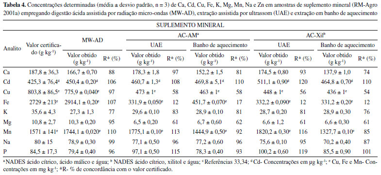 RESULTADOS E DISCUSSÃO Após a síntese, os NADES devem apresentar-se como solventes líquidos, homogêneos e estáveis, sem a formação de precipitado em temperatura ambiente e pressão atmosférica,36 o que os tornam adequados para o uso como solventes na etapa de preparo de amostra.10 Além disso, a ocorrência de interações intermoleculares, envolvendo ligações de hidrogênio, é uma característica da formação de NADES, já evidenciada em trabalhos anteriores.30,35 A adição de água na síntese dos NADES ocasiona uma diminuição nos valores de densidade e viscosidade devido ao enfraquecimento dessas interações intermoleculares.38 Viscosidade e densidade são características físico-químicas importantes que influenciam a eficiência de extração.39 Baixos valores de densidade e viscosidade aumentam a difusividade, ocasionando um maior movimento das moléculas e consequentemente aumentando a eficiência de extração.40,41 Os valores de densidade determinados foram 1,3260 ± 0,0002 e 1,3130 ± 0,0001 g mL-1 e viscosidade de 9,24 ± 0,06 e 11,09 ± 0,21 mPa.s, ambos para NADES AC-AM e NADES AC-Xil, respectivamente, a 24 °C.30 Considerando a determinação elementar por técnicas de plasma (i.e. ICP OES e ICP-MS), a viscosidade é um parâmetro importante na representatividade das amostras, influenciando nos processos de formação e transporte do aerossol até o plasma. Quanto maior a viscosidade, maior a tensão superficial e, consequentemente, menor a eficiência de introdução da amostra para o plasma.42 A viscosidade da solução afeta a formação do spray no nebulizador, portanto o tamanho das gotas e sua separação na câmara de nebulização são prejudicadas. Soluções mais viscosas geram gotas maiores e em menor quantidade, o que evidencia a importância da calibração do equipamento de análise empregando solução a base do solvente extrator, garantindo a compatibilização da matriz. Dessa forma, evita-se a falsa conclusão de que a extração foi menos eficiente quando se emprega um solvente mais viscoso, quando na realidade o que ocorre é a introdução de um menor volume de solução, diminuindo a sensibilidade do método.42 Estudos descrevem que o teor de água acima de 50% (m m-1) na síntese dos NADES dificulta significativamente a formação das interações intermoleculares de solventes eutéticos a base de cloreto de colina, levando à perda das suas propriedades físico-químicas.38 A ruptura das ligações de hidrogênio dos NADES leva à perda da eficiência de extração dos analitos em diferentes matrizes.38,43 No presente estudo, os NADES foram sintetizadas usando 10 moles de água (aproximadamente 36% m m-1), resultando em solventes com menor viscosidade em comparação com outros baseados em semelhantes combinações de precursores, anteriormente apresentados na literatura.44,45 Devido aos seus precursores, os NADES apresentam elevados teores de carbono, o que pode ocasionar interferência de transporte ou ainda instabilidade no plasma, dependendo da quantidade de carbono presente.46,47 Além disso, já foi demonstrado que as reações de transferência de carga com as espécies de carbono ocasionam aumento da taxa de ionização de alguns analitos devido ao aumento da população de átomos e íons dos analitos em estado excitado, resultando em aumento da sensibilidade, em razão do aumento do sinal analítico.48 Após a síntese dos dois diferentes NADES buscou-se avaliar sua potencialidade para a extração de As, Ca, Cd, Cr, Cu, Fe, K, Mg, Mn, Na, P e Zn em amostras de materiais de referência de suplemento mineral e fosfato de rocha com o auxílio de ultrassom e banho por aquecimento. Os resultados obtidos foram comparados com o procedimento comparativo empregado (MW-AD) e com os valores descritos nos laudos dos materiais de referência. Nas Tabelas 3 e 4 estão apresentados os teores indicados nos laudos dos materiais de referência, os obtidos para os analitos avaliados empregando MW-AD e extração pelos diferentes NADES utilizados, empregando UAE e extração por banho de aquecimento para as amostras de fosfato de rocha e suplemento mineral, respectivamente.