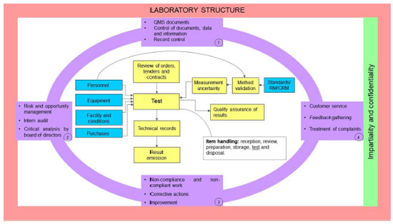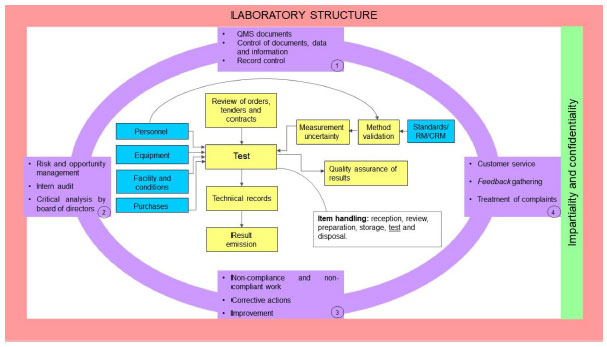 The requirements which belong to Section 5, Structural requirements, address the aspects that make the laboratory capable of doing its activities, the latter being considered the base of the QMS. On Figure 1, the laboratory structure is represented in a way that it encompasses all requirements left. The next group to be represented is Section 4, General requirements, which addresses impartiality and confidentiality in the development of the laboratories' activities, setting up the risk to impartiality management in a continuous manner. On Figure 1, this section is located with the structural requirements group. After the definition of the QMS basic parts, the management processes are represented. They guide and encompass all laboratory activities developed by the laboratory. These processes are represented in lilac, are separated in four blocks, and encircle the remaining requirements. These processes must be executed in the same manner for all tests addressed by the QMS, while other requirements might be specific depending on the laboratory activity. Most of these processes are requirements of Section 8, Management requirements, and include some requirements of Section 7, Process requirements. Inside the representation of the management processes are the processes directly related to the execution of laboratory activities, that may be specific. The Figure 1 represents a laboratory whose activities are restricted to tests only, excluding sampling activities. The processes represented by blue correspond to the Section 6 requirements, Resource requirements, and the processes in yellow correspond to the Section 7, Process requirements. These processes are placed in order to clarify how both resource and process requirements correlate to each other. In order to compare the 2017 version with the previous one (2005), it can be stated that the management requirements, previously categorised in section 4, are now reorganised within sections 4, 5 and 8; and the technical requirements, previously categorised in section 5, are now reorganised within sections 6 and 7. Given all the main changes between the 2005 and 2017 versions mentioned above, it is concluded that the new version of the norm proposes a more efficient management system, reducing the number of mandatory procedures and not requiring a quality manual, but focuses on consistent processes, with personnel able to perform them and maintain objective evidence of activities duly recorded. This new proposition may help laboratories to create and implement a QMS consistent with its own reality, according to the size of the personnel of each laboratory and the activity it develops (calibration or testing in multiple areas, such as environment, forensics, food and others). Also, the risk management is proposed to help laboratories assure the quality of its activities once the risk to laboratory activities and impartiality are now duly monitored and treated. In addition, this new version highlights the importance of meeting the customer demands through the adoption of a decision rule to report a final result. Focusing on the importance of the measurement provided by the laboratory to the customers' interests, this position reinforces the importance of laboratories to provide reliable and traceable results to support the decision making in different situations. In this way, ISO/IEC 17025 proposes a QMS through the requirements established and mentioned above to prove the technical competence and ensure the quality of the results produced by the laboratory. The use of this document can be presented as a tool to assist the implementation of the Quality concept in testing and calibration laboratories.