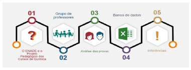 Já a etapa 04 consistiu na seleção de dados presentes nos relatórios elaborados pelo INEP para cada curso de Química das universidades envolvidas no projeto de pesquisa (UFRN, UFU, UTFPR e UFAM). Por exemplo, o desempenho de cada curso comparando aos resultados do Brasil, do Estado, das IES públicas e privadas, os índices de acerto em cada um dos distratores das questões entre outros. A partir desse volume de informações coletadas e das análises foi construído um Banco de Dados bastante didático e intuitivo, em que é possível fazer facilmente a leitura e interpretação tanto dos dados disponíveis nos relatórios do INEP (por exemplo, o desempenho de um determinado curso comparado aos resultados do Brasil, do Estado, das IES públicas e privadas; os índices de acerto em cada um dos distratores em uma determinada questão), bem como o cruzamento de novos dados (por exemplo, o conteúdo químico envolvido em uma questão com o desempenho dos estudantes do curso de Licenciatura da UFRN). Por fim, a etapa 05 na Figura 2 refere-se às inferências possíveis de serem realizadas a partir do cruzamento das variáveis do Banco de Dados do ENADE-Química. Essas, por sua vez, podem ser úteis ao corpo docente, levando-o a refletir sobre as características da formação inicial dos seus egressos em termos de processos de ensino e aprendizagem de conceitos científicos e de operações cognitivas. Cabe ressaltar que, apesar da análise ter sido realizada para todas as questões de Química (conhecimento geral e específico) e as de formação geral, para efeitos de comparação e análise gráfica que contribuísse com a etapa 05 de inferências, o banco de dados foi elaborado apenas com as questões objetivas. Assim, detalharemos a sua organização exemplificando com questões das provas dos anos de 2011, 2014 e 2017 em que foram abordados conceitos de conhecimento gerais de Química.