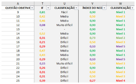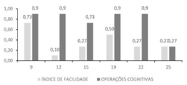 A partir da Figura 7 observamos que, para as questões 9 e 25, os índices IF e NCD são equivalentes (IF fácil-Nível 1 e IF difícil-Nível 5, respectivamente) e corroboram a classificação. A questão 12 foi anulada. Para as questões 15, 19 e 22 observamos discordâncias nas classificações. Na questão 15, o IF possui valor igual a 0,27, considerado então uma questão 'difícil' e NCD apresenta nível 2, ou seja, 'médio'. A questão 19 tem IF com valor igual a 0,50 (questão do tipo 'médio') e NCD nível 1 (questão 'fácil'). A questão 22 tem IF com valor igual a 0,27 e é classificada como 'difícil' e o NCD nível 1, questão 'fácil'. Essa última questão corrobora com nossa posição que a classificação do INEP considerar uma questão difícil não significa que a mesma exija do/a graduando/a habilidades de pensamento complexas. Embora não seja o escopo desse trabalho analisar todas essas correlações e fazer inferências, destacamos que esses dados podem suscitar interessantes discussões em termos de habilidades/operações cognitivas.