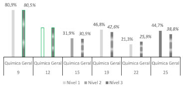 A partir desta comparação (Figura 5) é possível perceber que as questões (em sua maioria) requerem habilidades de pensamento de baixa ordem e, consequentemente, estão entre os níveis 1 e 2. Além disso, é possível observar que os concluintes do curso de Química da UFRN estão com o desenvolvimento em termos de habilidades de pensamento próximas ao que se observa no país. Outro ponto destacado é que nas questões 9 e 19 os concluintes da UFRN obtiveram um desempenho um pouco superior que a média nacional (80,9% e 80,5%; 46,8% e 42,6% respectivamente). Além disso, essas questões foram classificadas como nível 1 em termos de NCD, isso é, os/as estudantes para respondê-las tiveram que mobilizar operações cognitivas do tipo decodificar dados, buscar pela memória e aplicar fórmulas. Essas operações cognitivas foram necessárias na questão 22 e os/as estudantes da UFRN tiveram um desempenho menor que o nacional (21,3% e 25,9% respectivamente). Na questão 15, classificada como nível 2 para o NCD, os/as estudantes tiveram o desempenho muito próximo (31,9% da UFRN e 30,9% do Brasil), quer dizer, para resolver a questão mobilizaram operações como resumir, interpretar e generalizar. A questão 25 foi a única classificada como nível 3, envolvendo operações mais complexas como comparar, classificar e organizar os dados, e observamos um desempenho mais expressivo da UFRN em relação ao Brasil (44,7% e 38,8% respectivamente). Esses resultados podem nos levar a diversas inferências, como por exemplo, as diferenças nas estruturas curriculares ofertadas nos cursos de graduação em Química nas IES do Brasil ou ainda pode levar a uma análise, por parte do corpo docente da instituição, daquelas questões em que os/as estudantes tiveram baixo desempenho ou ainda uma investigação sobre quais operações cognitivas estão sendo desenvolvidas nos/nas estudantes do curso. Enfim, abre um leque de possibilidades e questionamentos. Por exemplo, é possível que o desempenho abaixo de 50% em quase todas as questões de Química Geral seja um reflexo do abandono ou da retenção dos/as alunos/as nessa disciplina? Há estudos que sinalizam as dificuldades neste campo de conhecimento em função de diversos fatores, entre elas a abordagem tradicional, o baixo nível de conhecimento básico dos/as alunos/as e a baixa aplicabilidade de seus conteúdos no cotidiano.18,20 Nesse sentido, nossa reflexão vai além, ao questionar se esse componente curricular está propiciando atividades para o desenvolvimento de habilidades de pensamento de alta ordem. Percentual dos distratores assinalados em cada questão Outra potencialidade do Banco de dados é o percentual dos distratores assinalados em cada questão (ver Tabela 1). Esses percentuais nos fornecem informações que podem levar a reflexões ou olhares mais aprofundados sobre a questão em si. A Figura 6 relaciona os percentuais dos concluintes da UFRN na prova do ENADE 2011 nas questões que abordam conteúdos de Química Geral.