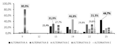 ![]() Figura 6. Percentual dos distratores assinalados - UFRN - Itens 9, 12, 15, 19, 22 e 25 do ENADE 2011 (autoria própria)