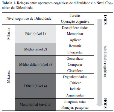 OPERAÇÕES COGNITIVAS/HABILIDADES DE PENSAMENTO NA RESOLUÇÃO DE TAREFAS As operações cognitivas ou também chamadas habilidades de pensamento são mobilizadas pela pessoa durante a resolução das tarefas.7,8 Podem ainda ser classificadas em habilidades de pensamento de ordem superior (alta ordem) ou inferior (baixa ordem).9,10 Tal perspectiva se relaciona com estudos do campo da psicologia.11 Particularmente, o modelo explicativo que busca descrever a mobilização das operações cognitivas é a abordagem do processamento humano de informação, a qual busca investigar os processos cognitivos envolvidos na resolução de tarefas. Por exemplo, quando uma pessoa resolve uma tarefa, é impulsionada a utilizar diferentes estratégias de pensamento que levam a ação.11 Há discussões desde a neuropsicologia em que se discute a classificação linear das operações cognitivas e do desenvolvimento perceptivo e cognitivo.12 Reconhecemos tais debates no campo da neurociência cognitiva em que o individuo diante de uma tarefa realiza várias conexões ao mesmo tempo e seus diferentes paradigmas explicativos.13 Entretanto, tal discussão foge do espoco de nosso estudo. Por outro lado, há um consenso em que na execução de tarefas, os indivíduos executam operações cognitivas, sejam de alta ou baixa ordem. Por fim, apesar das limitações de tal modelo, entendemos que ele nos auxilia a identificar certa hierarquia entre as habilidades de pensamento. Considerando tais discussões, as estratégias podem ser organizadas em dois grupos: (a) habilidades de ordem cognitiva superior, HOCS (Higher Order Cognitive Skills) que, de modo geral, abrangem capacidades como de formular questões, elaborar argumentos, criticar pontos de vista diferentes, solucionar problemas entre outras; (b) habilidades cognitivas de baixa ordem, LOCS (Lower Order Cognitive Skills) que envolvem, por exemplo, decodificar os dados apresentados na questão, buscar na memória o conceito, a lei ou a fórmula para resolver e, aplicar esta regra aos dados apresentados.9,10 É ainda com base nesse modelo que se apoia uma distinção entre habilidade cognitiva e competência.5 Assim, a habilidade cognitiva é mobilizada antes, durante e depois da execução de uma ação em que são apresentadas, como resultado final, respostas a um dado problema ou situação a partir de um conhecimento e a competência indicaria um nível padronizado na realização dessas ações.8,11 Em um caminho inverso, ao olhar as operações cognitivas em termos de habilidades de pensamento manifestadas pelos graduandos ao resolver uma dada questão ou tarefa, é possível inferir aquelas que estão sendo desenvolvidas nos cursos do ensino superior.14,15 É nesse sentido que apontamos a contribuição do nosso estudo. As operações cognitivas ou habilidades de pensamento podem ser consideradas em termos de dificuldade na execução da ação em função da compreensão e resolução em diferentes níveis.4,5 Há propostas de taxonomia das operações cognitivas, por exemplo, decodificar dados, memorizar, aplicar fórmulas ou regras, interpretar, generalizar etc.8,10,11,15,16 Essas, por sua vez, possuem diferentes níveis de complexidade. A Tabela 1, a seguir, apresenta a taxonomia utilizada em nossa análise para as operações cognitivas4,16,17,18 e sua elaboração teve apoio em outros referenciais.7,10