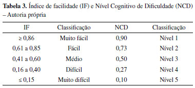 RESULTADOS E DISCUSSÕES A partir do Banco de dados foi possível comparar diferentes variáveis determinadas pelo INEP com a nossa classificação, o Nível Cognitivo de Dificuldade (NCD). Os índices do INEP são determinados estatisticamente, a saber: o índice de discriminação (ID) e o índice de facilidade (IF). O primeiro é determinado a partir do desempenho dos participantes e indica o nível de discriminação de uma questão. O ID possui as seguintes classificações: ≥ 0,40 (muito bom); 0,30 a 0,39 (bom); 0,20 a 0,29 (médio) e ≤ 0,19 (fraco). Com estes valores, segundo o INEP, uma questão com um ID elevado (≥ 0,40) significa que obteve um expressivo acerto pelos estudantes com bom desempenho na prova em comparação com os de desempenho ruim. Já o Índice de Facilidade (IF) se refere ao percentual de acerto de cada questão. É interessante destacar que não há correspondência entre o IF e o ID. Por exemplo, uma questão 'muito fácil' não necessariamente terá um ID 'muito bom', bem como uma questão 'difícil' ou 'muito difícil' não necessariamente terá um ID 'fraco'. Para o cálculo final das notas, as questões com ID fraco são desconsideradas. Assim, para nosso estudo comparativo o ID não foi considerado por não atender ao nosso foco. O indicador Nível Cognitivo de Dificuldade (NCD) emerge da análise desta pesquisa para atender nossa questão central em que propomos uma análise qualitativa das questões em termos de habilidades de pensamento/operações cognitivas. O NCD é classificado em 5 níveis, indo das habilidades de baixa ordem - LOCS (nível 1) até as de ordem superior - HOCS (nível 5). A Tabela 3 apresenta as classificações e os valores para o Índice de Facilidade e o Nível Cognitivo de Dificuldade.