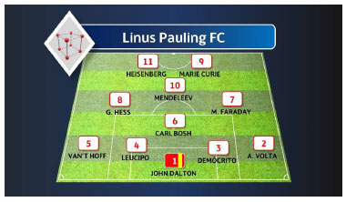 No gol o capitão John Dalton (#1), goleiro-artilheiro que atua bem nos dois lados do campo, assim como o fez estudando desde meteorologia à teoria atômica.18 O atomismo proposto por Dalton no século XIX é a base do conceito moderno de átomo,19 e ele, a base do time. Alessandro Volta (Conte Alessandro Giuseppe Antonio Anastasio Volta, italiano da Lombardia) é o lateral direito (#2): cheio de energia, é a pilha do time, dados seus estudos fundamentais da eletroquímica. Foi responsável pela invenção da pilha (bateria elétrica), fornecendo a primeira fonte de corrente contínua.20 Os zagueiros que sustentam o time representam a base do pensamento sobre a matéria: Demócrito (#3) e Leucipo (#4), filósofos gregos. Ambos são figuras centrais no desenvolvimento do atomismo filosófico e da teoria atômica do universo.21-24 Na lateral esquerda está Jacobus Henricus Van't Hoff (#6), holandês ganhador do primeiro Prêmio Nobel de Química em 1901,25 que dá mais movimento ao time, ágil por seus estudos sobre dinâmica química. Van't Hoff foi muito abrangente em seus estudos, cujas ideiais passaram pelo carbono tetraédrico, termodinâmica, teoria das soluções, cinética química e petrologia, sendo assim um dos mais importantes cientistas da sua época.26 O volante escolhido é Carl Bosch (#5), pois essa posição precisa de alguém saiba usar bem as condições de alta pressão. Tendo iniciado seus estudos em metalurgia e engenharia mecânica (de 1894 a 1896), o químico alemão começou a ler Química somente em 1896 (na Universidade de Leipzig). Recebeu com Friedrich Bergius o Prêmio Nobel de Química de 1931, pelo desenvolvimento de métodos químicos de alta pressão.27,28 No meio campo tem-se Michael Faraday (#7) e Germain Hess (#8). O camisa sete é constante (alusão a constante de Faraday, F, que representa a magnitude da carga elétrica por mol de elétrons). Faraday foi um dos maiores cientistas do século XIX. Sua maior contribuição foi no campo da eletricidade e do magnetismo, mas o químico e físico britânico contribuiu tanto no desenvolvimento quanto na divulgação da ciência.29 Ele foi pioneiro na produção de corrente elétrica a partir de um campo magnético, inventando também o primeiro motor e dínamo elétrico e demonstrando a relação entre a ligação química e a eletricidade.30 Já o número oito percorre diferentes caminhos, mas sempre com a mesma energia para encontrar o gol. Sua escolha para o time faz alusão à Lei de Hess, que afirma que a quantidade de calor envolvida numa reação química é a mesma, não importa quais e quantas etapas sejam envolvidas para obtenção do produto desejado. Essa lei desenvolvida pelo químico suíço-russo, preparou caminho para o desenvolvimento da termodinâmica química no final do século XIX, pelo famoso físico estadunidense Josiah Gibbs.31 O ataque é composto pela mulher que muito driblou o preconceito: Marie Curie ostenta a camisa 9, muito importante para o time. Nascida em Varsóvia (atualmente na Polônia) com o nome Marie Skłodowska, Curie ganhou duas vezes o Prêmio Nobel (Física em 1903 e Química em 1911) pelos estudos sobre radioatividade e descoberta dos elementos rádio e polônio.32 O cérebro do time, camisa 10, é Dmitri Mendeleev, aquele que sabe como organizar a periodicidade do time. Embora muitos outros cientistas se debruçaram anos em busca de organizar periodicamente os elementos conhecidos, Mendeleev (cientista russo) tem muito mérito em ser reconhecido como o pai da tabela periódica moderna. Dispondo os elementos conhecidos em ordem crescente de peso atômico, Mendeleev previu que alguns espaços vacantes seriam preenchidos por elementos ainda não conhecidos, tendo ele já previsto algumas de suas propriedades.33-35 Por fim, o número 11 é Werner Heisenberg, um finalizador que faz o goleiro sempre estar incerto, nunca sabendo a posição e a velocidade dos seus chutes. Físico e filósofo alemão, ganhador do Prêmio Nobel de Física em 1932 pela criação da mecânica quântica,36 Heisenberg foi responsável também pela formulação do princípio da incerteza, que estabelece que a posição e a velocidade de um objeto não podem ser medidas exatamente, ao mesmo tempo, nem mesmo em teoria. Ele também contribuiu na área de hidrodinâmica, estudou também o núcleo atômico, ferromagnetismo, raios cósmicos e partículas subatômicas.37
