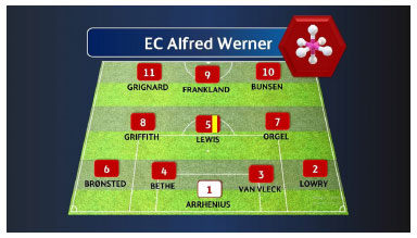 ESCALAÇÃO DO ESPORTE CLUBE ALFRED WERNER Com uma escalação 4-3-3, o EC Alfred Werner é um time complexo (Figura 2). Werner, químico suíço nascido em 1866, com sua audácia e vasto conhecimento, fundou bases conceituais da Química de Coordenação, o que lhe rendeu o Prêmio Nobel de Química em 1913.38-40