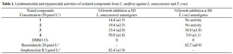 Compounds 1, 2, 3, and 4 are here described for the first time for C. uniflora species and Calea genus, but they have been identified in other plants of Asteraceae family. Desacetyleupaserrin (2) was previously reported in Helianthus pumilus,23 Eupatorium mikanioides24 and E. glehni,25 2α-hydroxy-8β-2',3',5'-trihydroxy-angeloyloxycostunolide (1) and 2α-hydroxy-8β-3'-hydroxy-2',5'-epoxyangeloyloxycostunolide (3) in Helianthus resinosus,20 and ovatifolin (4) in Podanthus ovatifolius, P. mitiqui22,26,27 and Blainvillea latifolia species.28 Results of the trypanocidal and leishmanicidal assays were expressed as percentage of growth inhibition from T. cruzi and L. amazonensis amastigotes and are summarized in Table 1. Ability of compounds to inhibit the parasites growth was evaluated at concentration of 50 µmol L-1. DMSO was used as negative control at a maximum concentration of 1% and did not interfere on parasites growth in any of bioassays. Amphotericin B at a concentration of 2.0 µmol L-1 was used as positive control against L. amazonensis, producing 82.4% growth inhibition. Benznidazole 20 µmol L-1, the drug of choice to treat Chagas' disease, was used as positive control against T. cruzi, causing an 82.7% inhibitory effect on parasitic growth.