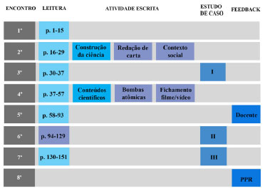 Terceiro Encontro: após a leitura das páginas 30-37, ocorreu a aplicação do primeiro estudo de caso, mencionado anteriormente. O Caso I aborda a questão relativa ao sigilo do Projeto Manhattan frente ao compartilhamento de ideias entre cientistas, decisão que, na história quadrinizada, recaía sobre o personagem Oppenheimer. Diante dessa situação, os alunos, assumindo o papel do físico norte-americano, precisavam argumentar se os cientistas deveriam se comunicar livremente dentro das instalações que compreendiam o Projeto Manhattan ou, se dadas as circunstâncias, essa opção seria inviável. O caso é finalizado com a questão: "Deveria Oppenheimer seguir com o plano de deixar os cientistas livres para falar o que quisessem, mas só dentro do laboratório, ficando por conta dos cientistas policiar a si mesmos? Por quê?". A dinâmica seguida durante a aula foi aquela relacionada à aplicação de todos os estudos de caso (Figura 3). Quarto Encontro: foi realizada a leitura das páginas 37-57. Na sequência, foi proposta uma atividade escrita com o intuito de fazer com que os alunos retomassem conhecimentos químicos fundamentais para o entendimento da HQ. Na primeira parte da atividade, os alunos precisavam indicar e definir os conceitos químicos expostos, desde o início da narrativa até a página 57, relacionados ao processo de construção da bomba atômica, apontando a importância de cada um para o funcionamento efetivo da arma, enquanto que na segunda parte, a resposta ao seguinte questionamento precisava ser apresentada.
