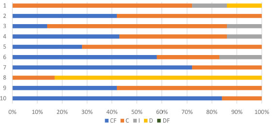 ![]() Figura 5. Questionário de percepção sobre as atividades pautadas no uso da HQ, no qual CF = Concordo Fortemente, C = Concordo, I = Indeciso, D = Discordo e DF = Discordo Fortemente