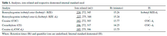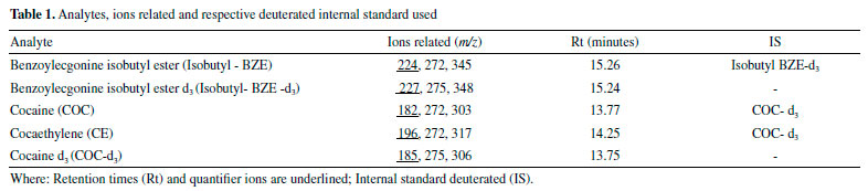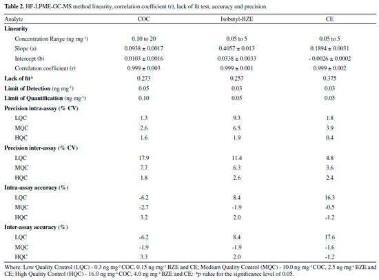 The polypropylene hollow fiber (9 cm) was immersed in organic phase (dihexyl ether) and the system was poured five times. Then, the fiber lumen was filled in with HCl 0.05 mol L-1 (50-70 µL) (acceptor phase) and the edges of the fiber were sealed and placed into the solution of the Eppendorf tube. The system was transferred to ultrasonic bath, where it remained for 10 minutes, for analytes extraction from the aqueous solution through an organic solvent migrating to the acceptor solution. This process is specific and selective, since the analytes are in a more ionized state (lumen fiber) and do not return to the aqueous solution. The extract was taken from inside the fiber and evaporated in water bath (40 °C). In order to carry out the analysis in GC-MS, the samples were resuspended in 50 µL of ethyl acetate and 1.0 µL was injected into GC-MS.22 Case samples A total of 14 authentic hair samples were obtained from patients admitted to a rehabilitation clinic. Along with sample collection, the donors were interviewed for collecting data, such as age at the moment of the interview, the age at which they started making use of the drugs previously mentioned, rehabilitation period, types of drugs consumed and consumption pattern. The criteria of positivity were: COC ≥ 0.5 ng mg-1 and CE or BZE ≥ 0.05 ng mg-1 (Society of Hair Testing).24 Hair samples free from the drugs (COC, BZE e CE) were provided by volunteers who are nonusers. The study was approved by the Ethics Committee for Research on Human Beings from the State University of Maringá (number 458.185). All the participants signed an informed consent form. Validation procedure The method described was validated in accordance with the guidelines of the Scientific Working Group for Forensic Toxicology (SWGTOX),26 Society of Hair Testing24 and the United Nations Office on Drugs and Crime (UNODC).27 A validation protocol was followed, comprising parameters such as selectivity, linearity, limit of detection, limit of quantification, precision, accuracy, matrix effect and carryover. Selectivity The selectivity test was evaluated through the analysis of ten blank hair samples (with no standards addition) and two zeros (blank samples with the addition of internal standards).24 The presence or absence of any interfering peaks (endogenous substances), at a significant level, close to the retention time of the analytes and the internal standard were evaluated.26 Linearity Linearity of the method was stablished in hair samples. Working range of 0.1 to 20 ng mg-1 for COC and 0.05 to 5 ng mg-1 for BZE and CE were used. The analyses of six different concentrations, within the range stablished, were carried out in five repetitions. Calibration curves of the analytes were obtained by correlation between the signal response (area ratio of the analyte peak and the internal standard) and analyte concentration in the sample.26 Acceptance criteria include the correlation coefficient (r) above 0.99. Evaluation of the homoscedasticity of the calibration model was carried out through the Lack of Fit test (significant level of 5%), with the statistical software Minitab®18.26,27 Limit of detection (LoD) and limit of quantification (LoQ) Determination of LoD and LoQ were obtained by fortifying three different blank hair samples analyzed in triplicate. LoD was defined as the lowest concentration capable to produce a reproducible response of the instrument, three times higher (or more) than the noise level of the background signal of the blank samples, and to reach predefined detection criteria. The LoQ estimated was considered to be the lowest concentration capable of obtaining detection, identification, accuracy and precision criteria in all the three fortified samples. Intra-day and inter-day precision and accuracy Intra-day precision and accuracy were evaluated through the analysis, on the same day, of five replicates (n=5) of blank (hair) samples enriched with the analytes (COC, BZE e CE) in three (3) control levels, a low control (0.3 ng mg-1 of COC, 0.15 ng mg-1 BZE and CE), medium control (10 ng mg-1 of COC and 2.5 ng mg-1 of BZE and CE) and high control (16 ng mg-1 of COC and 4 ng mg-1 of BZE and CE). Inter-day accuracy and precision were evaluated during three consecutive days, in five repetitions. Accuracy and precision together determine the total error of the analysis. Precision was calculated by using the coefficient of variation (% CV). Accuracy was determinated by the comparison between the quantified and the enrichment concentration at each control level, and should be expressed as a percentage (%). The acceptance criterion for both parameters was ≤ ± 15% for all concentrations, except at the LoQ, in which ≤ ± 20% was accepted. Matrix Effect Test solutions (without adding hair matrix) containing the internal standards and the analytes at six different concentrations (identical to the calibration curve) were extracted and performed in triplicate. The values obtained were compared to those obtained by the triplicate of the calibration curve (with the addition of a hair matrix). The significant difference in all slopes of the linear curves was evaluated by the p-value. As acceptance criterion has been considered p-value > 0.05, proving parallelism of the lines and absence of constituents of the matrix that could interfering in the analysis. The statistical test performed was Student's t test, using the Minitab®18 software. Carryover For the analysis of the carryover, three injections of a single blank sample was analyzed, one of them before and two others after the injection of a sample at the highest point of the calibration curve. The results of the blank sample injections were compared with those obtained from the LoQ.