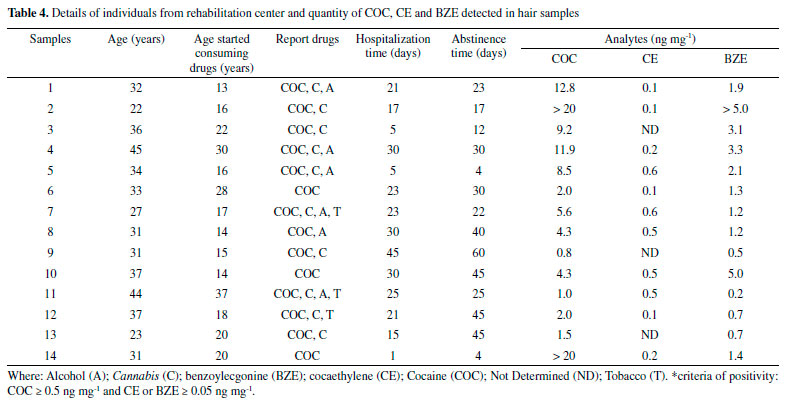 Table 4 presents the concentrations of all analytes found in the 14 samples analyzed, which were positively confirmed for COC and BZE. Only three samples were not positive for CE, which matches the reports by these patients, who stated not to consume alcohol and cocaine simultaneously. Concentrations obtained for COC ranged from 0.8 to > 20 ng mg-1. Regarding BZE, concentrations varied from 0.2 to > 5 ng mg-1. The period during which they had been taking part of the rehabilitation program ranged from 1 to 45 days by the time they were interviewed. All the samples analyzed were provided by volunteers who claimed to have used cocaine along with other drugs. The interviewees stated to have made use of the drug (COC) for the last time between 4 and 60 days before the interview (Table 4). Therefore, in some samples, analytes presented concentrations that were high than the superior limit of quantification stablished within the method. For the CE analyte the highest values obtained were 0.6 ng mg-1. Figure 3.4 represents a positive result, in which the concentrations obtained were 8.5 ng mg-1, 0.6 ng mg-1 and 2.1 ng mg-1 for COC, CE and BZE, respectively. A study carried out by Gambelunghe et al.,34 applied to 90 hair samples, classified the use of cocaine at mild (0.5-3 ng mg-1), moderate (3.1-10 ng mg-1) and severe (10.1-40 ng mg-1). According this classification, at the present study 5 samples were fit at mild use, 5 classified within the moderate category, and 4 in the severe use class. This information can be usseful in the treatment process, as care must be intensified in chronic users classified as moderate and severe. The individuals who claimed early and continuous uses showed greater concentrations of COC, thus proving that hair samples are an adequate biological matrix for analyzing drugs. Moreover, the data collected had been available for use at the rehabilitation facility so as to assist in the treatment of chemical dependents. The use of hair sample over conventional samples is preferable due to the fact that its collection is simple, the procedure is not invasive, and, in forensic situations, it can be done under strict supervision so as to avoid adulteration and samples replacement.8,9 Treatments provided by rehabilitation clinics can benefit society and support the rehabilitation of chemical dependents, as well as help to control and, eventually, overcome addiction. It is evident that chemical dependency treatments combined with monitoring the use of drugs are pivotal. Thereby, the interview conducted in rehabilitation clinics, associated with drug analysis, is a means by which the profile of the interned patient can be known, as example, at what age the patient started the consume of drugs and which drugs are the most used. These allowing devising prevention strategies to minimize relapse or even prevent the death of users.