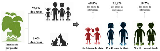 De acordo com os dados do Sistema Nacional de Informações Tóxico-Farmacológicas (SINITOX), as principais vítimas de intoxicação por plantas são crianças de 0 a 14 anos de idade (Figura 2),9 que representam dois terços dos casos de intoxicações em humanos (6,6% dos casos relatados são em animais domésticos). A cada dez casos de intoxicação por plantas no Brasil, seis são de crianças menores de nove anos de idade, sendo em sua maioria casos acidentais, principalmente por não haver o conhecimento prévio dos responsáveis sobre o potencial tóxico das espécies utilizadas.10 O contato de crianças com estas espécies vegetais tóxicas pode ser residencial, mas também ocorre muito frequentemente em outros ambientes. Em um estudo realizado em 85 jardins de infância e centros de cuidados para crianças observou-se que 31% das plantas analisadas eram potenciais causadoras de injúrias.11