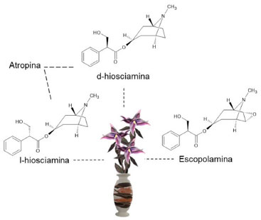 Milhares de alcaloides são conhecidos, porém poucos são tóxicos. Os alcaloides mais tóxicos caracterizam-se por ter sabor amargo, fator importante para prevenir a ingestão da planta.53 Dentre os alcaloides tóxicos encontrados em plantas, os chamados "beladonados" são os mais conhecidos e consistem na escopolamina, l-hiosciamina e atropina (mistura racêmica de d-hiosciamina e l-hiosciamina) (Figura 9). Estas substâncias são alcaloides tropânicos encontrados em várias plantas, como a beladona (Atropa belladonna), por isso o nome associado a eles.