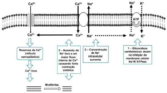 Glicosídeos cardiotóxicos atuam na inibição da membrana celular Na+/K+ATPase (Figura 11), que é bomba responsável pelo transporte ativo e contínuo de íons sódio e potássio e que está diretamente ligada aos processos de contração muscular e condução dos impulsos nervosos. A inibição dessa bomba resulta no esgotamento do potássio intracelular e, portanto, aumenta a quantidade de sódio, o que leva à acumulação elevada de cálcio no sistema.62,63