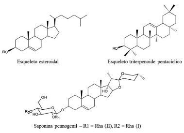 ![]() Figura 12. Estruturas das saponinas derivadas de esteroides e triterpenos, respectivamente