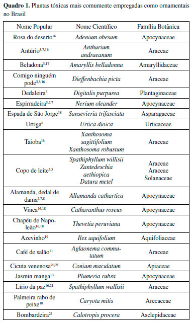 Esse alto índice de intoxicações por plantas se deve ao fato de muitas espécies tóxicas serem comumente utilizadas como decorações em ambientes domésticos. No entanto, devido à falta de conhecimento sobre a toxicidade destas espécies, muitas vezes elas são colocadas em locais de fácil acesso para crianças e animais, que em consequência de sua curiosidade natural, acabam se acidentando. No Quadro 1 estão listadas as plantas ornamentais mais empregadas no Brasil e que possuem substâncias tóxicas. A tabela completa pode ser encontrada no Material Suplementar.
