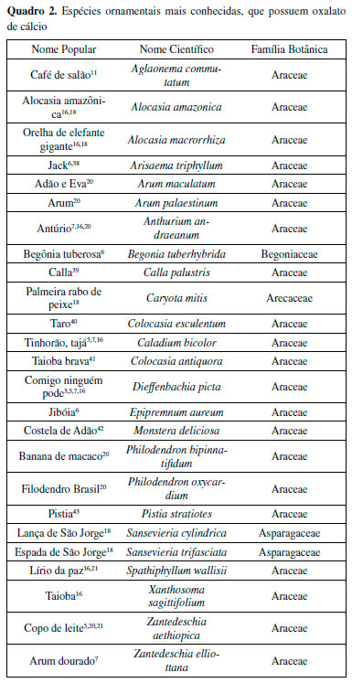 Dentre as principais espécies utilizadas como ornamentais e nas quais se é notável a presença de oxalato de cálcio estão as plantas do Quadro 2. Pode-se destacar entre essas a taioba, planta alimentícia que apresenta oxalato de cálcio tanto nas folhas quanto nos tubérculos.37