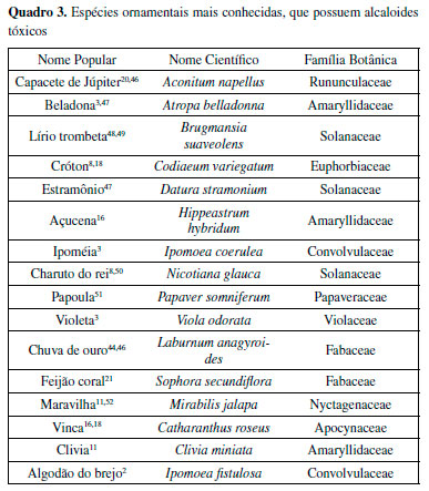 REFERÊNCIAS 1. Sá, M. R.; Revista Brasileira de História da Ciência 2012, 5 (supl), 12. 2. Hoehne, F. C.; Plantas e substâncias vegetais tóxicas e medicinais, Departamento de Botânica do Estado, São Paulo, 1939. 3. Mircea, C.; Draghia, L.; Bulletin UASVM Horticulture 2014, 71, 180. 4. Vasconcelos, J.; Vieira, J. G. de P.; Vieira, E. P. de P.; Rev. Cient. UFPA 2009, 7, 1. 5. da Silva, P. H.; Oliveira, Y. R.; Silva, A. P. de J.; Barros, H. N. de B.; Meireles, V. de J. S.; de Barros, H. N.; de Abreu, M. C.; Rev. Intertox Toxicol. Risco Ambient. Soc. 2015, 8, 19. 6. Poppenga, R. H.; Mol. Clin. Environ. Toxicol. 2010, 2, 123. 7. Martins, T. D.; Geron, V. L. M. G.; Revista Científica Da Faculdade De Educação E Meio Ambiente 2014, 79. 8. Campos, S. C.; Silva, C. G.; Campana, P. R. V.; Almeida, V. L.; Rev. Bras. Plantas Med. 2016, 18, 373. 9. https://sinitox.icict.fiocruz.br/dados-nacionais, acessado em Março 2021. 10. Alves, R. B. da S.; de Lima, F. A.; Coutinho, M. de S.; de Meneses, A. B.; de Lima, E. L. M.; Meira, A. M. B.; de Araújo, C. R. F.; Mariz, S. R.; Revista Ciência em Extensão 2016, 12, 79. 11. Cuadra, V. P.; Cambi, V.; Rueda, M. de los Á.; Calfuán, M.; Ethnobotany Research and Applications 2012, 10, 77. 12. https://www.ibge.gov.br/estatisticas/sociais/habitacao, acessado em Março 2021. 13. Medeiros, L. F. S.; Pereira, M.; Nucleus 2008, 5, 209. 14. Rodrigues Silva, L. R.; Carolina de Abreu, M.; Pinheiro Ferreira, P. M.; Landim Pacheco, A. C.; Felício Calou, I. B.; Santos Cerqueira, G.; Revinter 2015, 7. 15. Hoeffel, J. L. de M.; Gonçalves, N. de M.; Fadini, A. A. B.; Seixas, S. R. da C.; Vitas 2011, 1, 1. 16. de Souza, R. dos S.; Biodiversidade 2019, 2, 79. 17. Martin, S. F.; Alkaloids Chem. Pharmacol. 1987, 30, 251. 18. Costa Silva, L.; Revista da Sociedade Brasileira de Arborização Urbana 2019, 4, 69. 19. Anadón, A.; Martínez-Larrañaga, M. R.; Ares, I.; Martínez, M. A.; Veterinary Toxicology: Basic and Clinical Principles 2018, 891. 20. Mircea, C.; Draguia, L.; Bull. Hortic. 2014, 71, 180. 21. Parker, D.; N. Z. Med. J. 2012, 125, 87. 22. Waikar, S.; Srivastava, V. K.; Med. J. Armed Forces India 2015, 71, 92. 23. Simões, C. M. O. Farmacognosia, da planta ao medicamento, 3I ed., Editora da Universidade UFPR: Curitiba, 2001. 24. Lorenzi, H.; Matos, F. J. A.; Plantas Medicinais no Brasil, 1I ed., Instituto Plantarum: Nova Odessa, 2008. 25. Neto, G. G.; Carniello, M. A.; Quintais Mato-Grossenses, 1I ed., Unemat: Cáceres, 2008. 26. Franco, I. J.; Fontana, V. L.; Ervas e Plantas - A Medicina do Simples, 10I ed., Edelbra: Porto Alegre, 2003. 27. Farelli, M. H.; Plantas que Curam e Cortam Feitiços, 1I ed., Pallas: Rio de Janeiro, 2002. 28. Veiga, V. F.; Pinto, A. C.; Maciel, M. A. M.; Quim. Nova 2005, 28, 519. 29. Franceschi, V. R.; Horner, H. T.; Bot. Rev. 1980, 46, 361. 30. Franceschi, V. R.; Nakata, P. A.; Annu. Rev. Plant Biol. 2005, 56, 41. 31. de Oliveira, R. R.; Pasin, L. A. A. P.; Revista de Ciências Ambientais 2017, 11, 41. 32. Ciler, M.; Acta Biol. Cracov., Ser. Bot. 2009, 51, 105. 33. Gonzalez, J. A. Z.; Costa, M. D.; Silva, I. R.; Neves, J. C. L.; Barros, N. F. de; Borges, A. C.; Rev. Bras. Ciênc. Solo 2009, 33, 555. 34. Doaigey, A. R.; Am. J. Bot. 1991, 78, 1608. 35. Saito, S. R. M.; Lima, V. F. G. A. P.; Rev. Saúde 2009, 3, 25. 36. Nakata, P. A.; Plant Sci. 2003, 164, 901. 37. Ramos, A. S.; Verçosa, R. M.; Teixeira, S. M. L.; Teixeira-Costa, B. E.; Cienc. Tec. Alim. 2020, 40, 705. 38. Jadhav, D. R.; Gugloth, R.; Indian J. Care Med. 2019, 23, 242. 39. Hsueh, K. F.; Lin, P. Y.; Lee, S. M.; Hsieh, C. F.; J. Chinese Med. Assoc. 2004, 67, 93. 40. Libert, B.; Franceschi, V. R.; J. Agric. Food Chem. 1987, 35, 926. 41. Lucena, G. L.; Silva, A. G.; Honório, L. M. C.; Santos, V. D.; Sci. Plena 2012, 8, 1. 42. Bruni, I.; De Mattia, F.; Galimberti, A.; Galasso, G.; Banfi, E.; Casiraghi, M.; Labra, M.; Int. J. Legal Med. 2010, 124, 595. 43. Volk, G. M.; Lynch-Holm, V. J.; Kostman, T. A.; Goss, L. J.; Franceschi, V. R.; Plant Biol. 2002, 4, 34. 44. Waller, G. R.; Nowacki, E. K.; Alkaloid biology and metabolism in plants, Springer: New York, 1978. 45. Robinson, T.; Science 1974, 184, 430. 46. Colombo, M. L.; Assisi, F.; Puppa, T. Della; Moro, P.; Sesana, F. M.; Bissoli, M.; Borghini, R.; Perego, S.; Galasso, G.; Banfi, E.; Davanzo, F.; J. Pharm. Sci. Res. 2010, 2, 417. 47. Glatstein, M.; Alabdulrazzaq, F.; Scolnik, D.; Am. J. Ther. 2016, 23, e74. 48. Dickel, O. E.; Aguiar, R. B. de; Geracitano, L.; Monserrat, J. M.; Barros, D. M.; Rev. Bras. Farm. 2010, 91, 189. 49. Alves, M. N.; Sartoratto, A.; Trigo, J. R.; J. Chem. Ecol. 2007, 33, 297. 50. Botha, C. J.; Penrith, M. L.; J. Ethnopharmacol. 2008, 119, 549. 51. Lehmann, K. A.; Supportive Care in Cancer 1997, 5, 439. 52. Khan, R. U.; Mehmood, S.; Khan, S. U.; Pak. J. Pharm. Sci. 2018, 31, 57. 53. Villar, D.; Ortiz Díaz, J.; Plantas Tóxicas de Interés Veterinario, 1I ed., Elsevier: New York, 2006. 54. Gonzales Gil, P.; Revista de Química 2010, 24, 11. 55. Majak, W.; J. Range Manage. 2001, 54, 494. 56. Câmara, A. C. L.; Dalcin, L.; Soto-Blanco, B.; Semina: Cienc. Agrar. 2014, 35, 1961. 57. Francisco, I. A.; Pinotti, M. H. P.; Braz. Arch. Biol. Technol. 2000, 43, 487. 58. Yakubu, M. T.; Bukoye, B. B.; Contraception 2009, 80, 308. 59. Yang, C. J.; Wang, Z. Bin; Zhu, D. L.; Yu, Y.; Lei, Y. T.; Liu, Y.; Molecules 2012, 17, 5396. 60. Kakes, P.; Biochem. Syst. Ecol. 1991, 19, 519. 61. McVann, A.; Havlik, I.; Joubert, P. H.; Monteagudo, F. S. E.; South African Med. J. 1992, 81, 139. 62. Soto-Blanco, B.; Fontenele-Neto, J. D.; Silva, D. M.; Reis, P. F. C. C.; Nóbrega, J. E.; Trop. Anim. Health Prod. 2006, 38, 451. 63. De Paula Pedroza, H.; Ferreira, M. G.; de Carvalho, J. G.; Melo, K. D. A.; Keller, K. M.; Melo, M. M.; Soto-Blanco, B.; Cienc. Rural 2015, 45, 864. 64. Szakiel, A.; Pączkowski, C.; Henry, M.; Phytochem. Rev. 2011, 10, 471. 65. Stefanowicz-Hajduk, J.; Bartoszewski, R.; Bartoszewska, S.; Kochan, K.; 