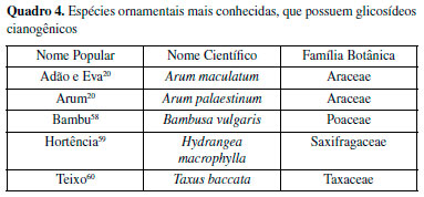 Seus efeitos tóxicos se devem ao fato desses compostos serem anticolinérgicos, que atuam como antagonistas da acetilcolina. Esses alcaloides inibem os receptores muscarínicos, que são responsáveis por captar sinais extracelulares e ativam vias de transdução de sinal no interior da célula, agindo no sistema parassimpático. Antagonistas muscarínicos possuem um efeito estimulatório sobre a atividade locomotora, mediado pelo aumento na liberação de acetilcolina.48 Plantas contendo substâncias anticolinérgicas vêm sendo utilizadas há muitos séculos em medicamentos fitoterápicos, em cerimônias religiosas e também como venenos. Como a acetilcolina é uma molécula mensageira essencial para a ativação muscular, para as glândulas que secretam fluidos corporais e para muitas funções cerebrais, esses alcaloides são responsáveis por interferir em todos esses processos.54 Glicosídeos: cianogênicos, cardiotóxicos e saponinas Uma vasta gama de glicosídeos tóxicos ocorre em plantas vasculares e os mais abundantes são glicosídeos cardiotóxicos, glicosídeos cianogênicos e as saponinas. Dentre as funções destes compostos, as principais são a atração de polinizadores ou dispersores de sementes e a repulsão ou inibição de herbívoros e microrganismos. Concentrações de glicosídeos tóxicos em plantas podem ser significativamente afetadas por estresse fisiológico no ambiente em que se encontram, como deficiência de água ou de nutrientes. Outros fatores que podem afetar os níveis de glicosídeos são o estágio de crescimento, a acumulação em tecidos específicos da planta, a localização geográfica e topográfica da planta e os efeitos sazonais do clima e do solo.55 Além dos principais glicosídeos tóxicos (cardiotóxicos, cianogênicos e saponinas) também podem ser encontrados glicosídeos antraquinônicos, terpenoides, indoides, esteroides e cumarínicos. Glicosídeos cianogênicos Glicosídeos cianogênicos, quando enzimaticamente hidrolisados, formam ácido cianídrico em um processo definido como cianogênese. O ácido cianídrico é extremamente tóxico para inúmeros organismos devido à sua habilidade de se ligar com metais que são grupos funcionais de diversas enzimas, inibindo processos como redução de oxigênio na cadeia respiratória e transporte de íons na fotossíntese e em atividades enzimáticas. Existem fortes evidências de que a cianogênese é um dos mecanismos utilizados pela planta como defesa contra predadores.56,57 Dentre as principais plantas que possuem glicosídeos cianogênicos (Quadro 4) estão: