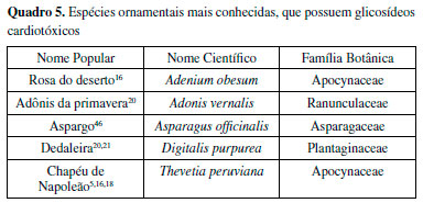 A inibição por cardenolídeos afeta as concentrações eletrolíticas intracelulares, resultando em contrações do miocárdio muito potentes. São substâncias terapêuticas para humanos, em doses medicinais, mas também são tóxicas quando consumidas nas concentrações naturais encontradas nas plantas. Todos os glicosídeos cardiotóxicos devem ser considerados como altamente tóxicos.55 Dentre as espécies de plantas que possuem glicosídeos cardiotóxicos, as principais estão listadas no Quadro 5: