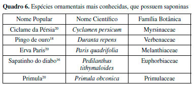 Apesar de sua ampla distribuição, apenas um pequeno número de espécies vegetais contém saponinas que são tóxicas para mamíferos, as mais conhecidas estão listadas no Quadro 6. Um exemplo de saponina presente em uma das espécies desse quadro é apresentado na Figura 12, uma saponina do tipo pennogenil (SP), de Paris quadrifolia.65 Essa toxicidade é atribuída à dificuldade de absorção desta substância pelo trato gastrointestinal. O efeito tóxico das saponinas é geralmente iniciado pela interação com as membranas mucosas, causando alterações de permeabilidade ou perda de enzimas ligadas à membrana. A destruição da aderência das membranas celulares da mucosa resulta em lesões intestinais e gastroenterite grave. Nessas condições, as saponinas podem ser absorvidas pelo trato gastrointestinal e produzir efeitos sistêmicos, como danos ao fígado, insuficiência respiratória, convulsões violentas e coma. A capacidade das saponinas de romper as membranas celulares aumenta sua atividade quando administradas por via intravenosa.55