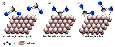 ![]() Figura 2. Esquema representativo das possíveis espécies de CO2 adsorvida sobre a superfície de um catalisador. Adaptado de Gattrell et. al.21