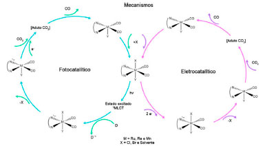 ![]() Figura 3. Mecanismos genéricos para redução de CO2 a CO via foto e eletrocatálise. Adaptado de Takeda et al e Manbeck et al.31,34