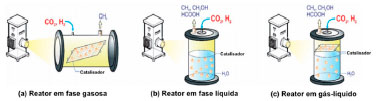 ![]() Figura 6. Três tipos de reatores: (a) reator em fase gasosa, (b) reator em fase líquida e (c) reator gás-líquido. Adaptado de Chen et al.174